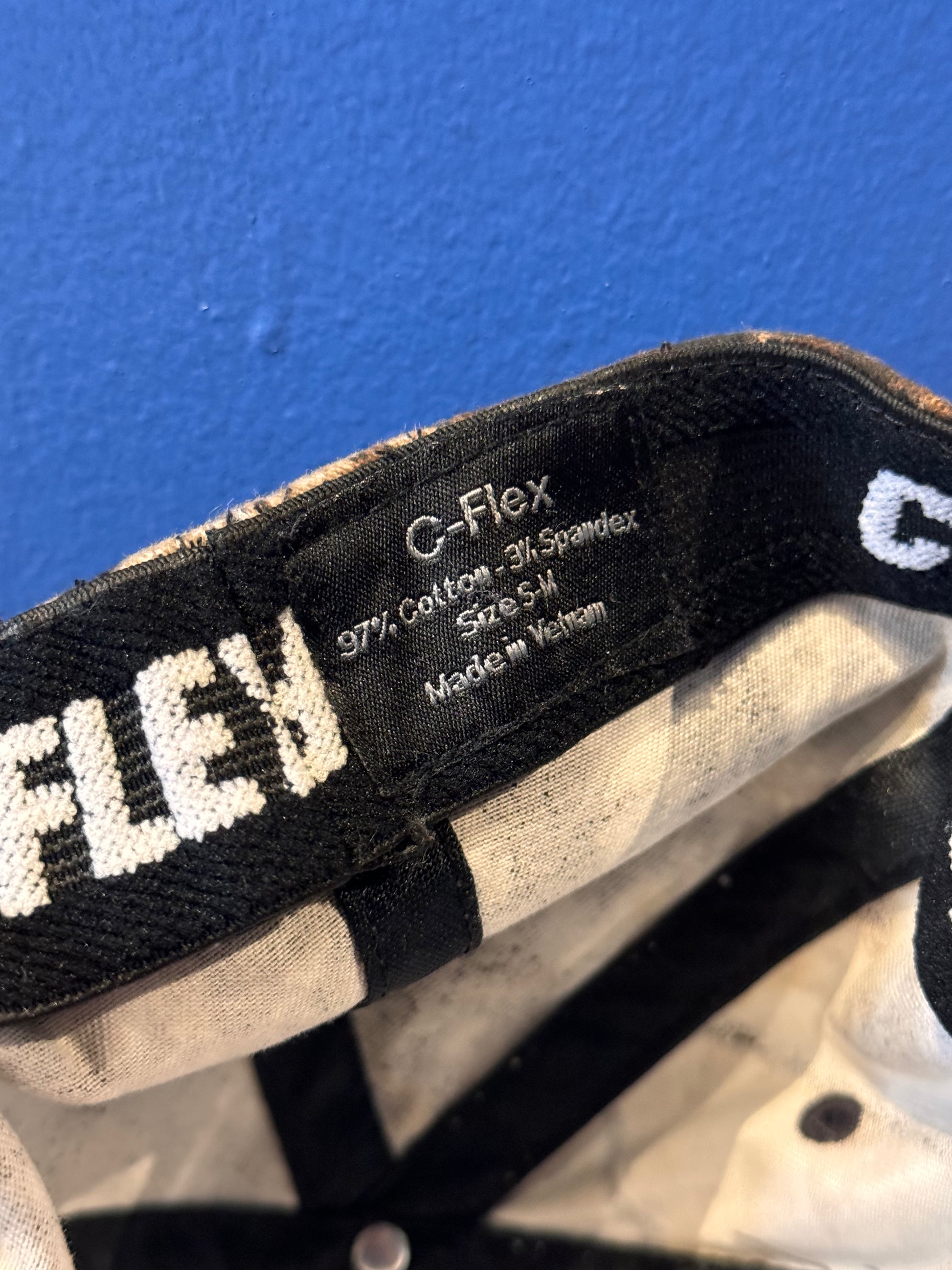 Camo hat with ABC Cutting Contractors Inc. embroidered branding. Elastic/spandex fit, size S-M.
