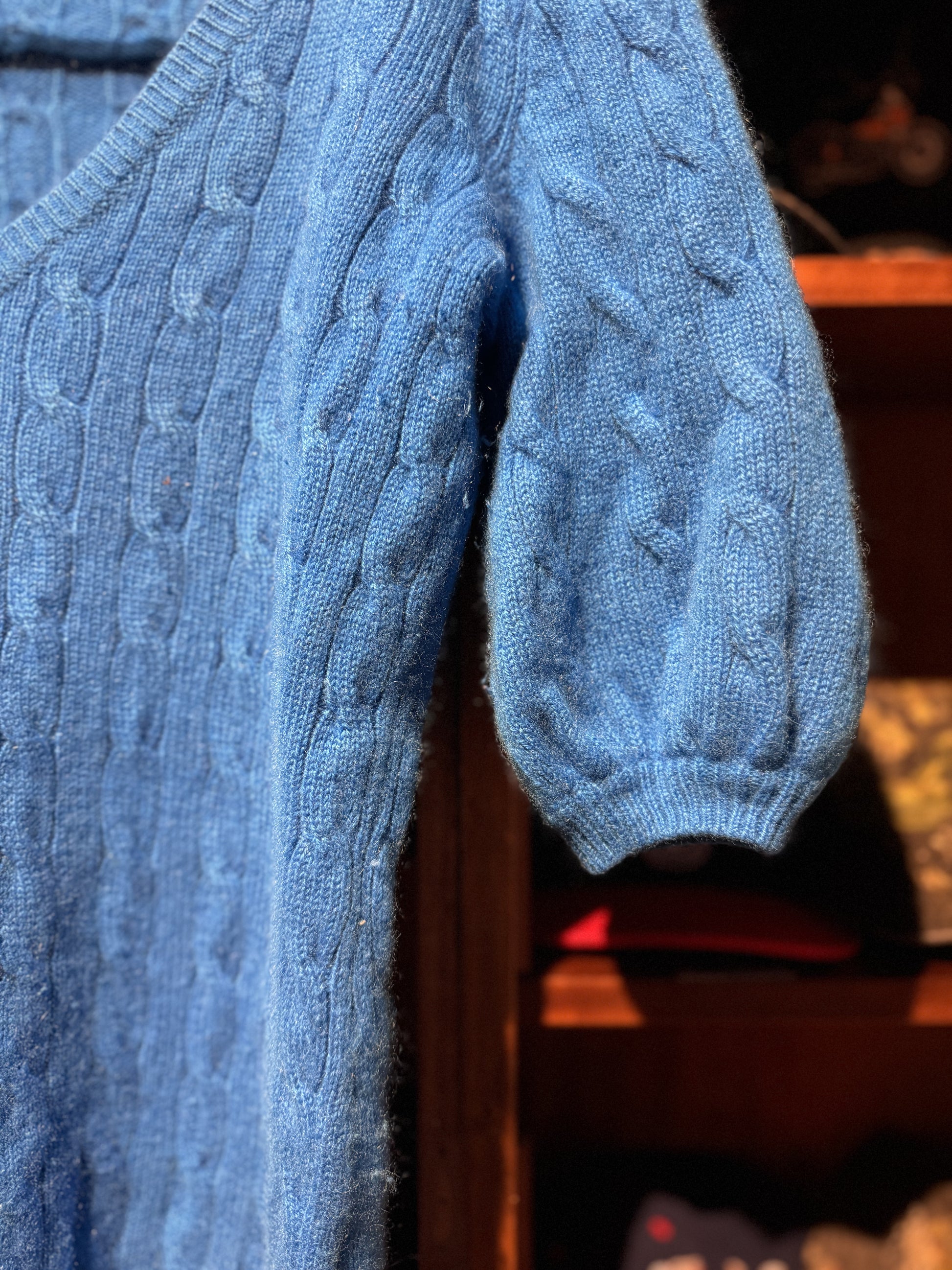 Vintage brilliant blue Ralph Lauren cable knit v-neck sweater with puffy sleeves. Pure cashmere.