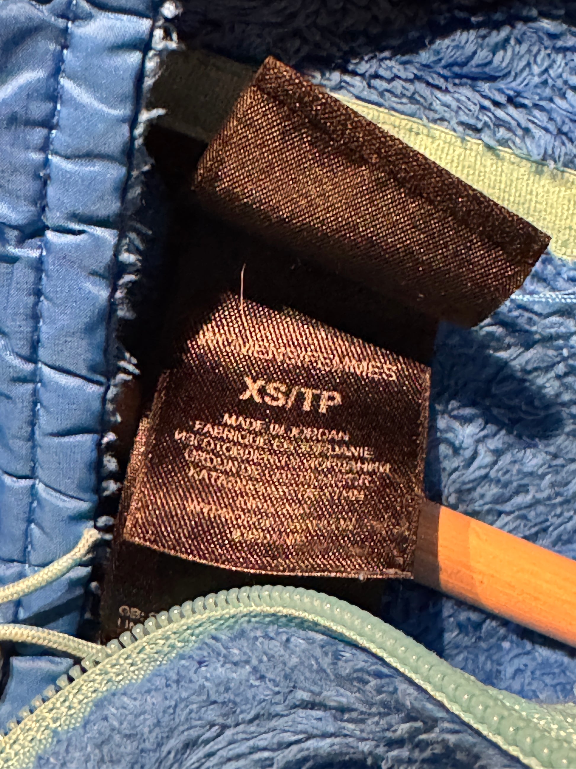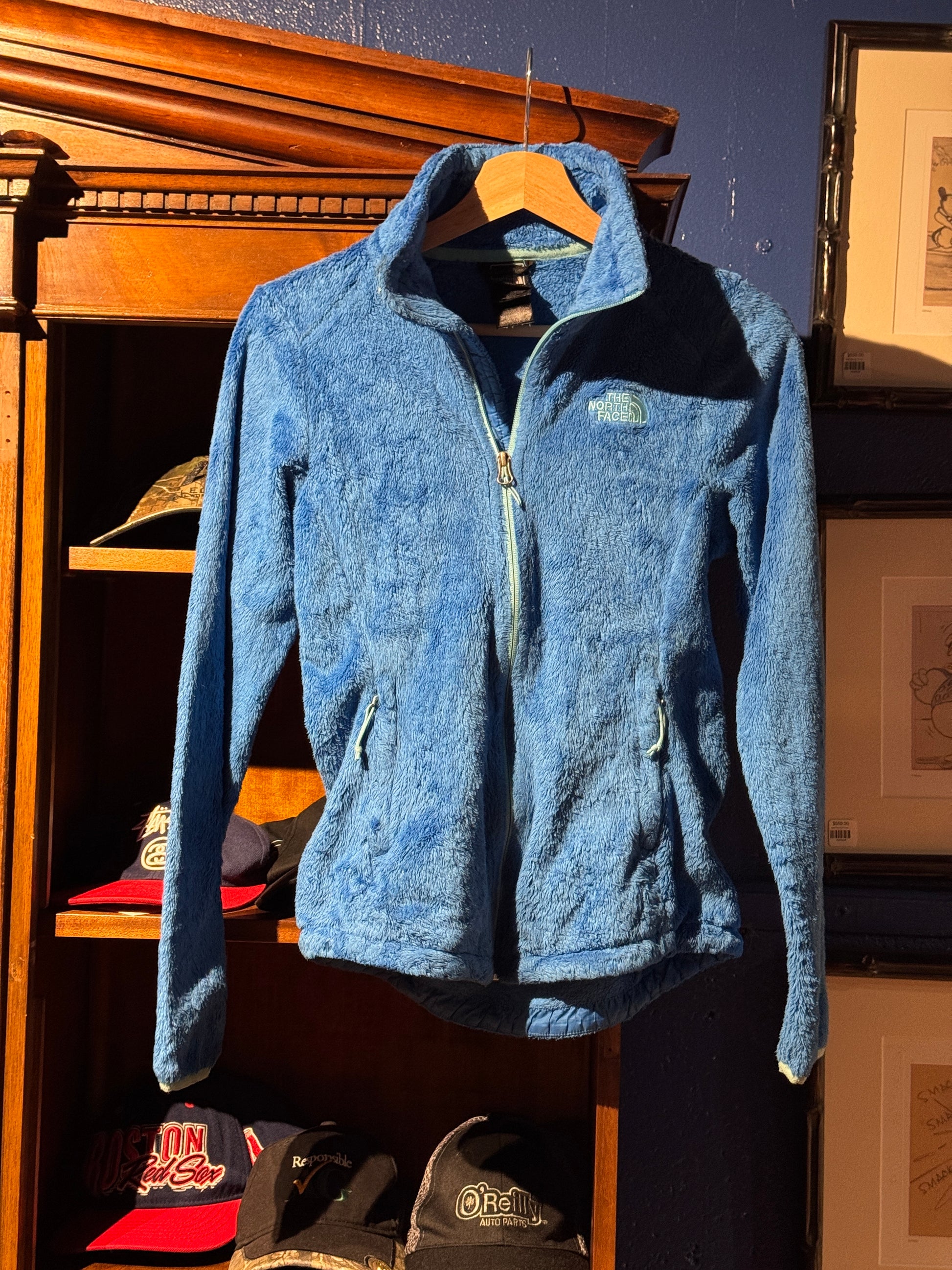 Super soft, plush blue TNF fleece in a women’s XS, perfect for cold-weather layering or throwing on for everyday warmth. Full-zip front, zipped hand pockets and classic embroidered chest logo. Cosy, lightweight and easy to wear.