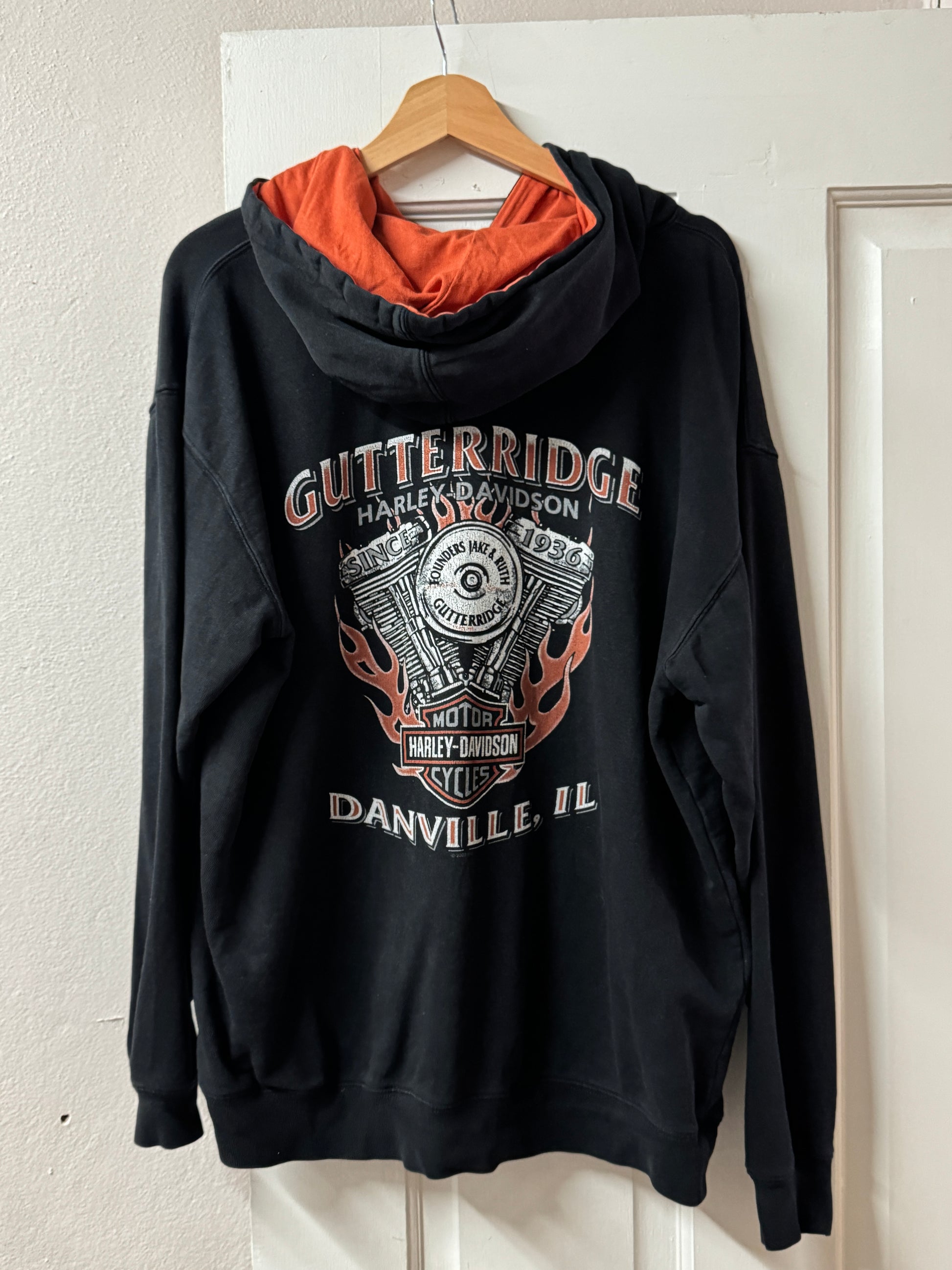 Classic Harley-Davidson pullover hoodie featuring large front chest logo with flame graphics and bold Gutterridge Danville Illinois dealership print across the back. Black cotton blend with contrast orange hood lining and kangaroo pocket.