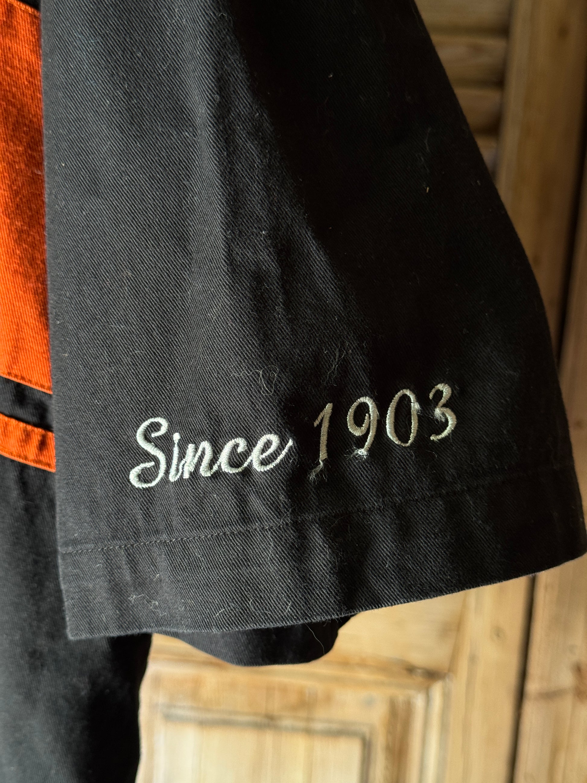 A classic Harley Davidson workshop-style shirt in the iconic black and orange combo, covered in embroidered patches front and back. Features the “Since 1903” sleeve script, chest badges, back panel branding and authentic HD logos throughout. Made from 100% cotton with that structured vintage feel - perfect worn open, layered or on its own.