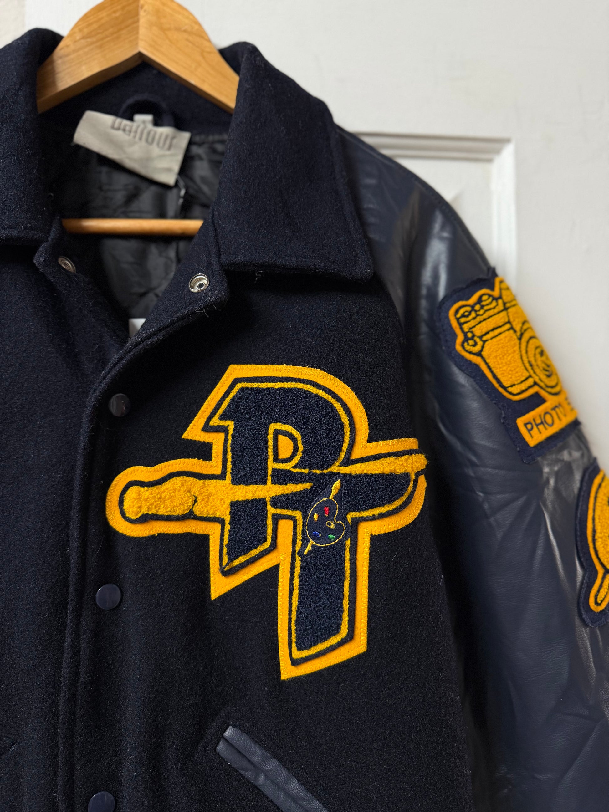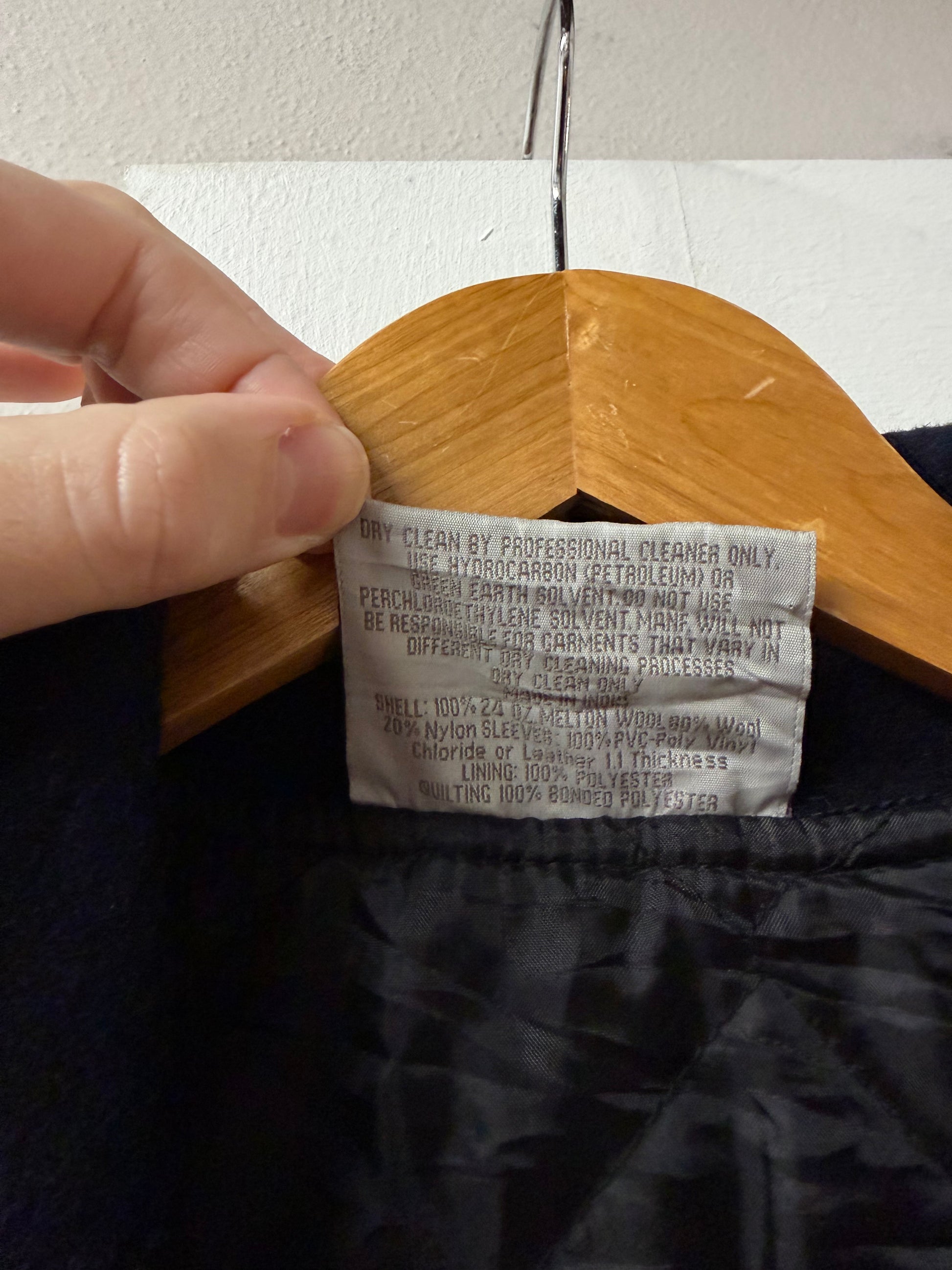 Striking navy wool and polyester varsity jacket with yellow patch embroidery and striped cuffs, waist and neckline. Good weight to it. Minor signs of wear.
