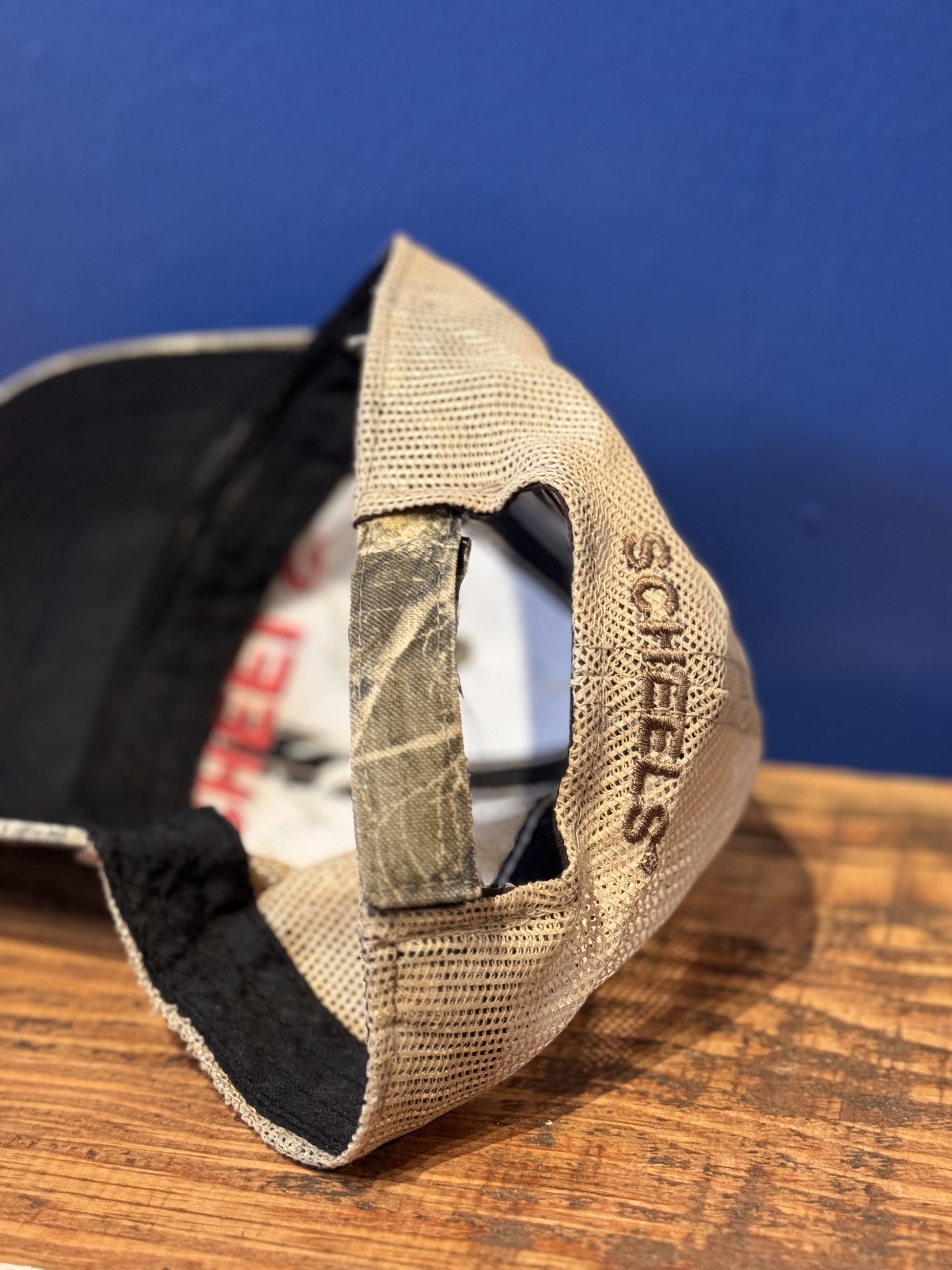 Camo trucker hat with beige mesh back and embroidered 'Scheels Colorado' logo. Velcro closure.