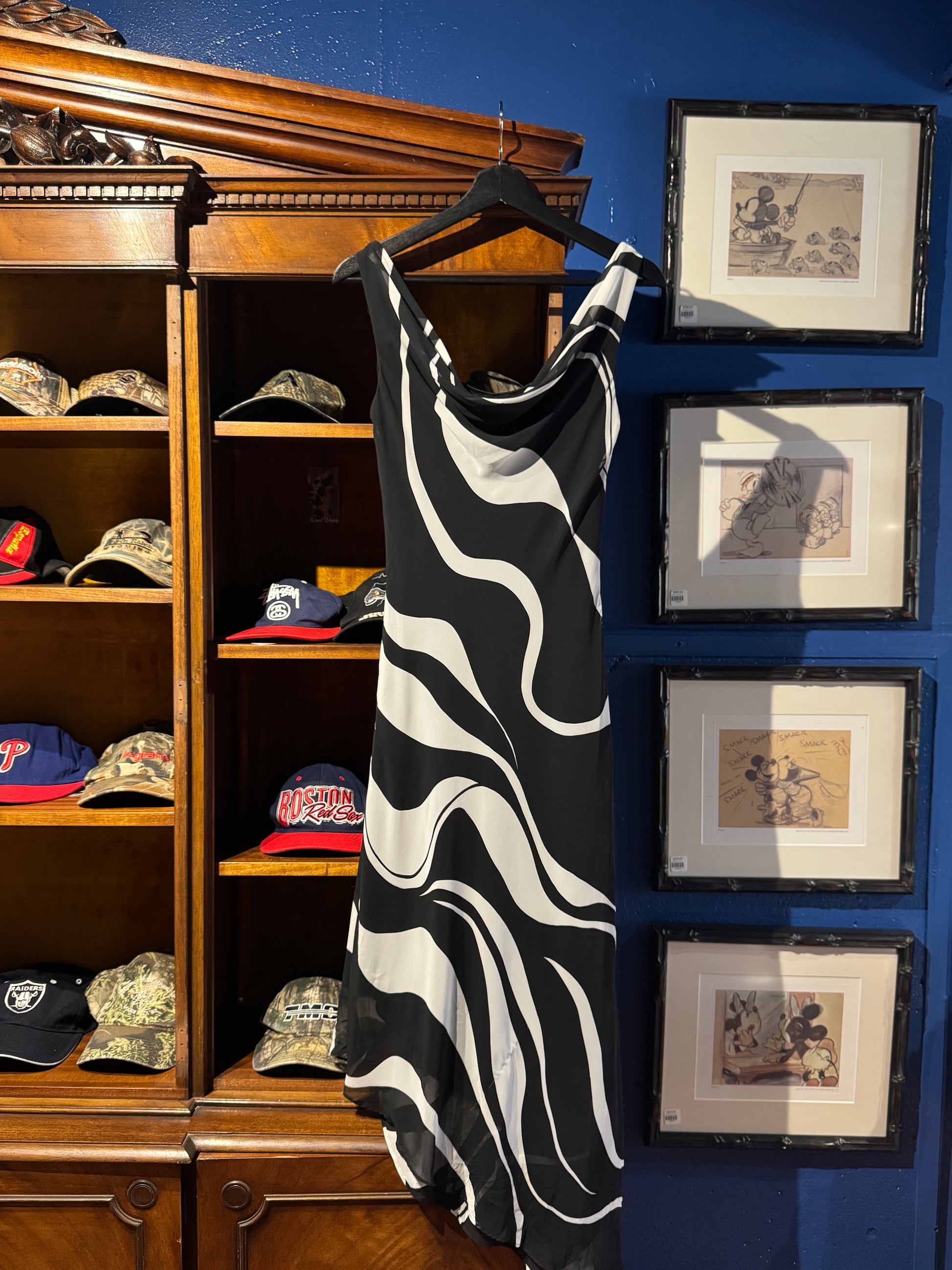 A striking Y2K-era swirl dress with a fluid asymmetrical hem and soft draped neckline. Lightweight, floaty and perfect for parties, nights out, or anyone who loves a bold monochrome moment.