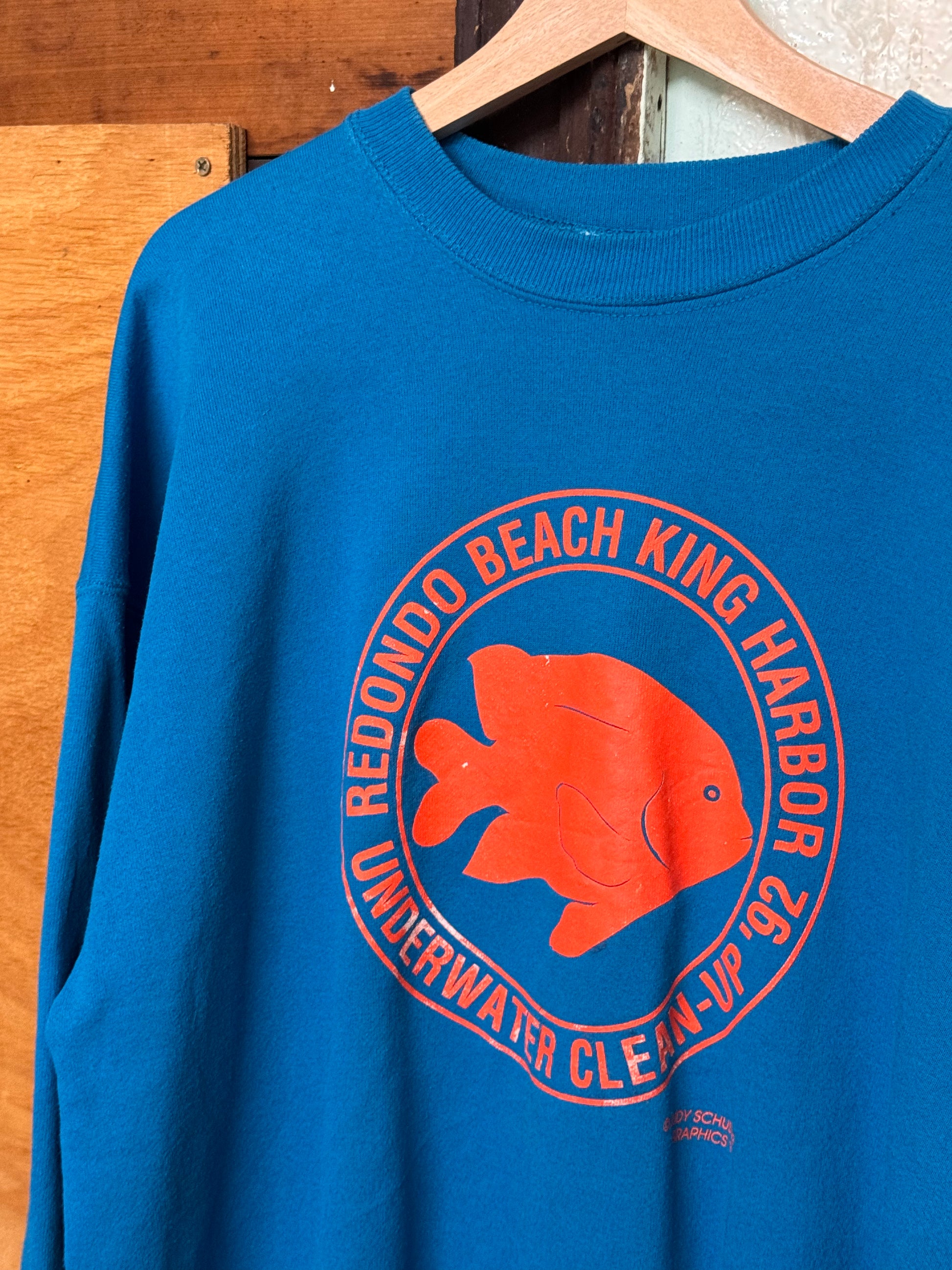 Vintage heavyweight blue crewneck sweater with orange graphics to front and back commemorating Redondo Beach King Harbor Underwater Clean Up 1992. Heavyweight fabric.