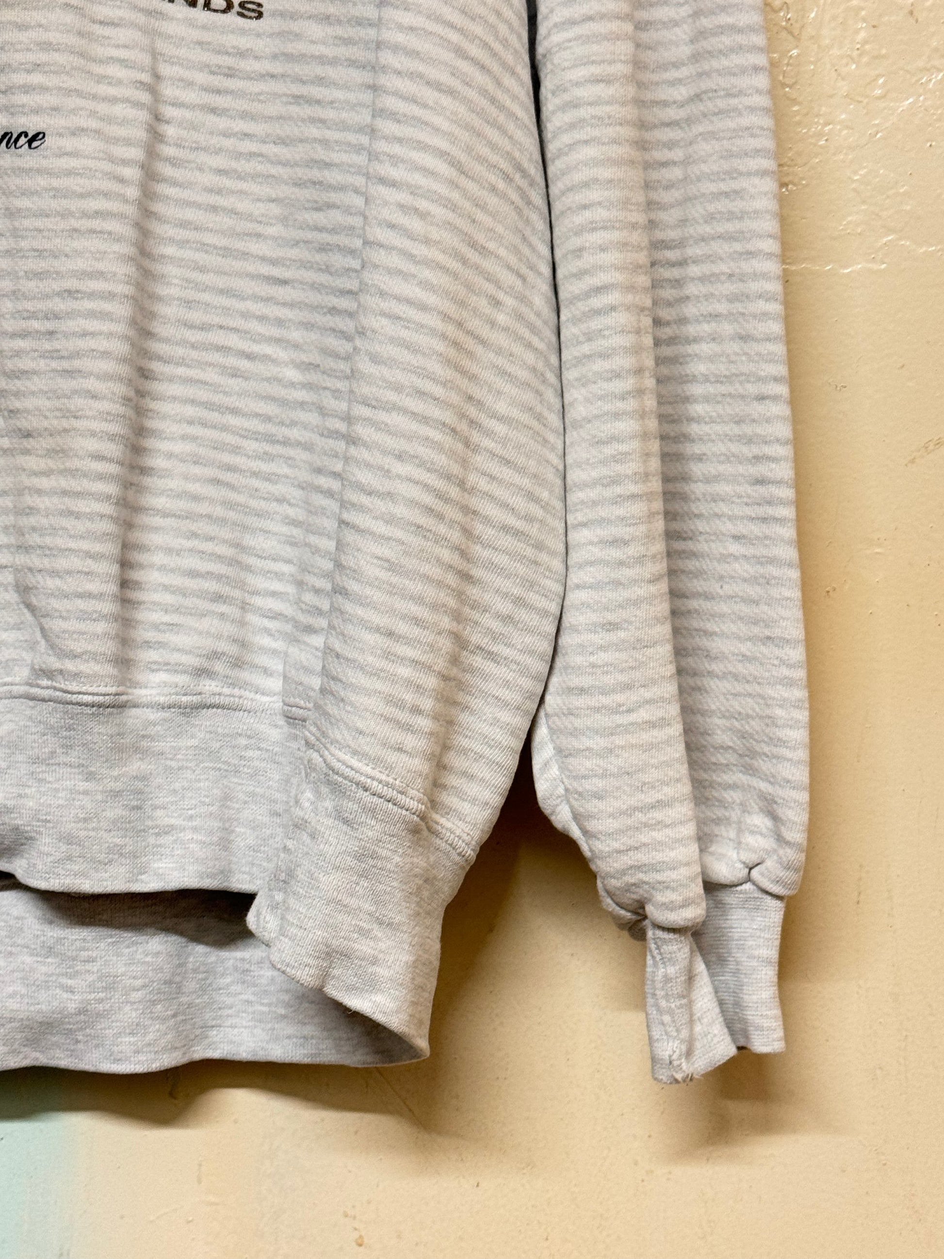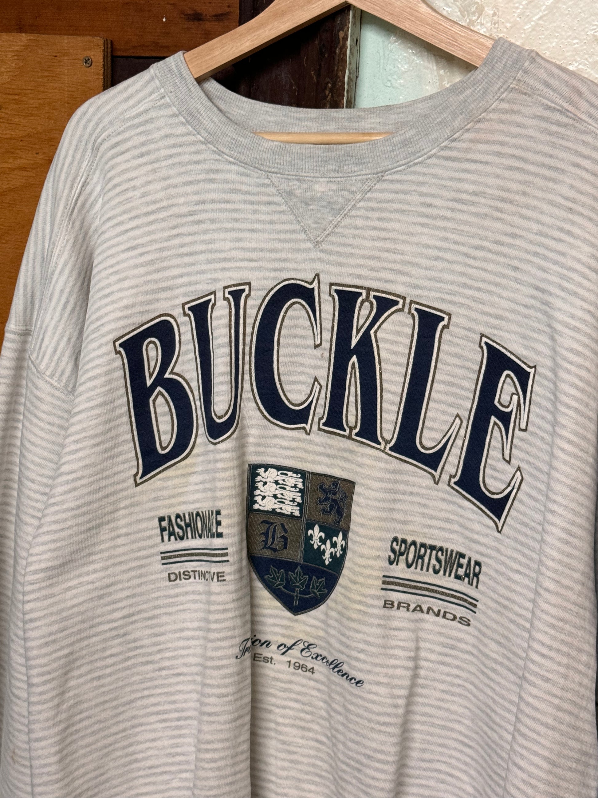 Vintage heavyweight white and grey striped crewneck sweater with 'Buckle / Fashionable Sportswear' graphic and crest to front. Heavyweight fabric. Some faint stains.