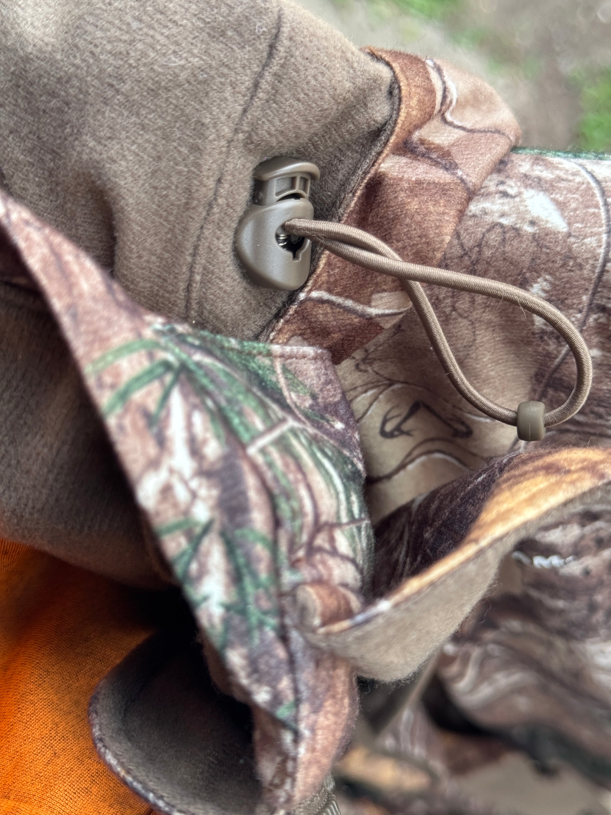 Rugged camo hunting jacket by Field & Stream, featuring a waterproof HydroProof Ultra shell and insulated SmartHeat lining for warmth. Includes a zip and snap front, drawstring hood, and multiple utility pockets. Made in Vietnam. Shell: 100% polyester, lining: 100% nylon.