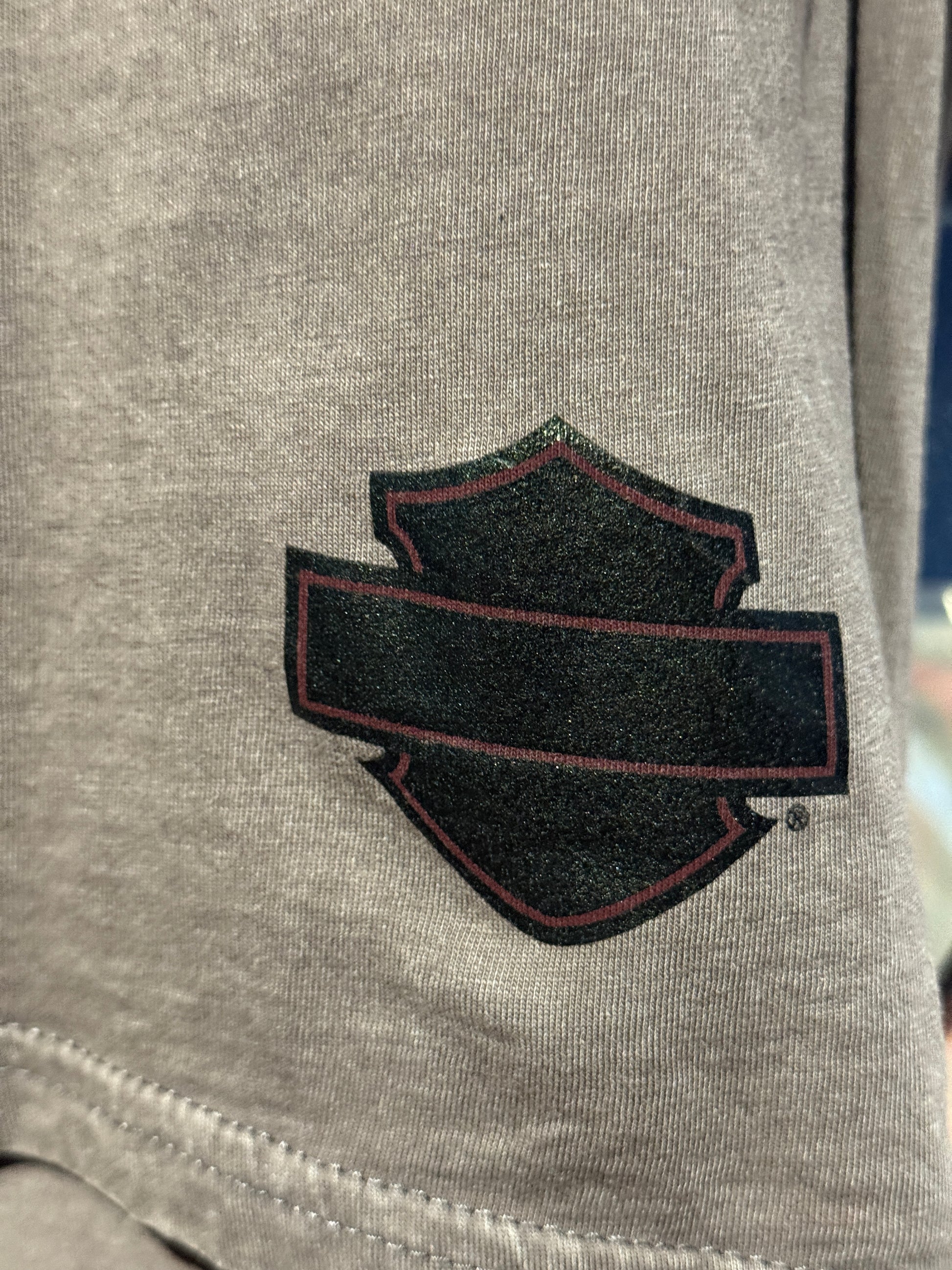 A proper early 2010s era Harley piece with attitude. Faded grey cotton base with gothic Harley script across the front, cold shoulder cut outs and long sleeves that do all the work. Soft, worn in and perfectly slouchy in that way only vintage Harley gets right. Front graphic features classic Harley gothic lettering, with Legendary Motorcycles Las Vegas Harley Davidson Nevada print across the back. Easy throw on piece that works loose or half tucked with denim, cargos or cut offs.
