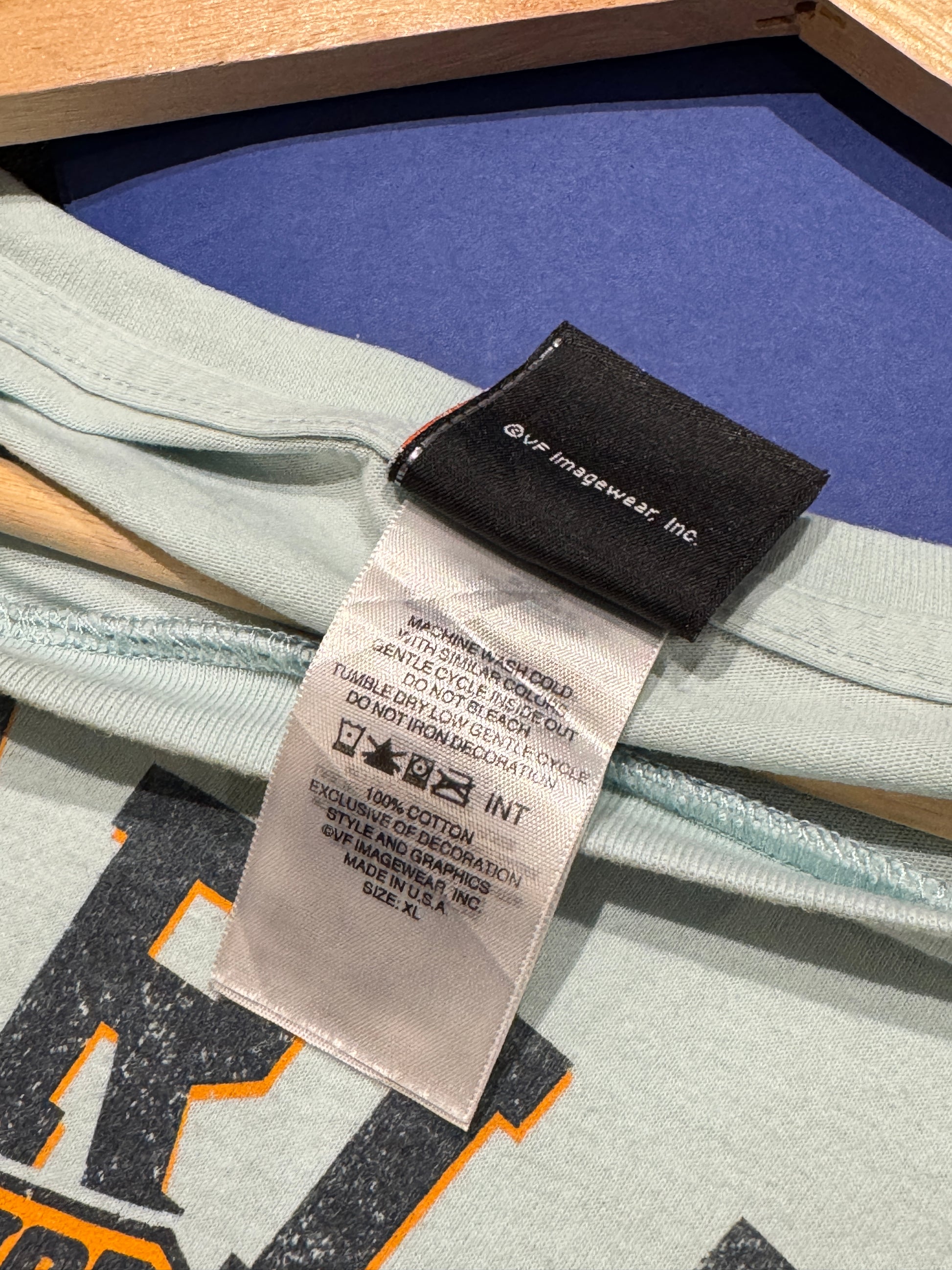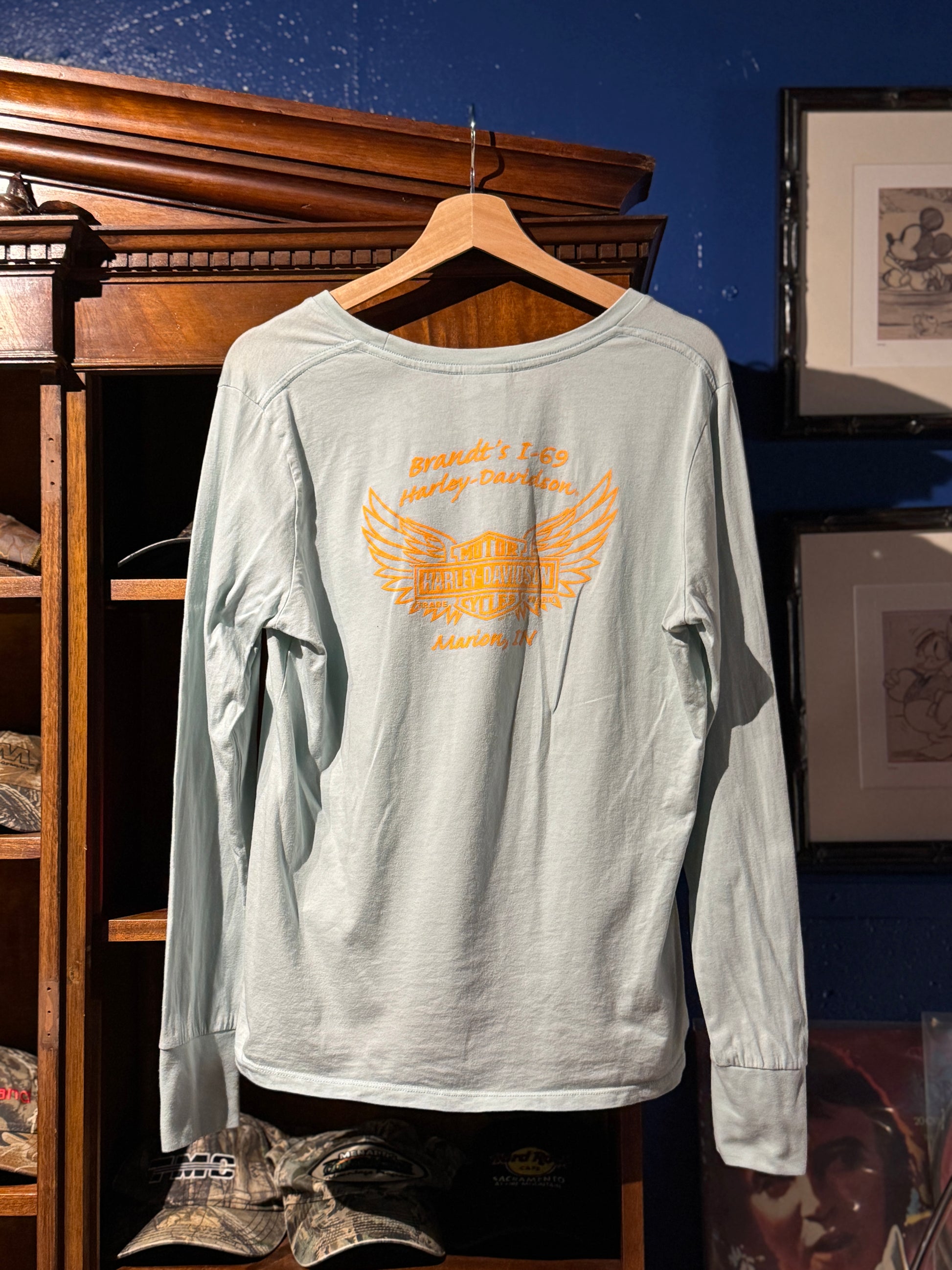 Soft vintage Harley-Davidson long sleeve in a washed pale mint tone. Features classic Harley-Davidson chest print to the front and bold winged dealership graphic to the back reading Brandt’s I-69 Harley-Davidson, Marion, IN. Easy everyday long sleeve with a relaxed drape and that perfectly broken-in vintage feel.
