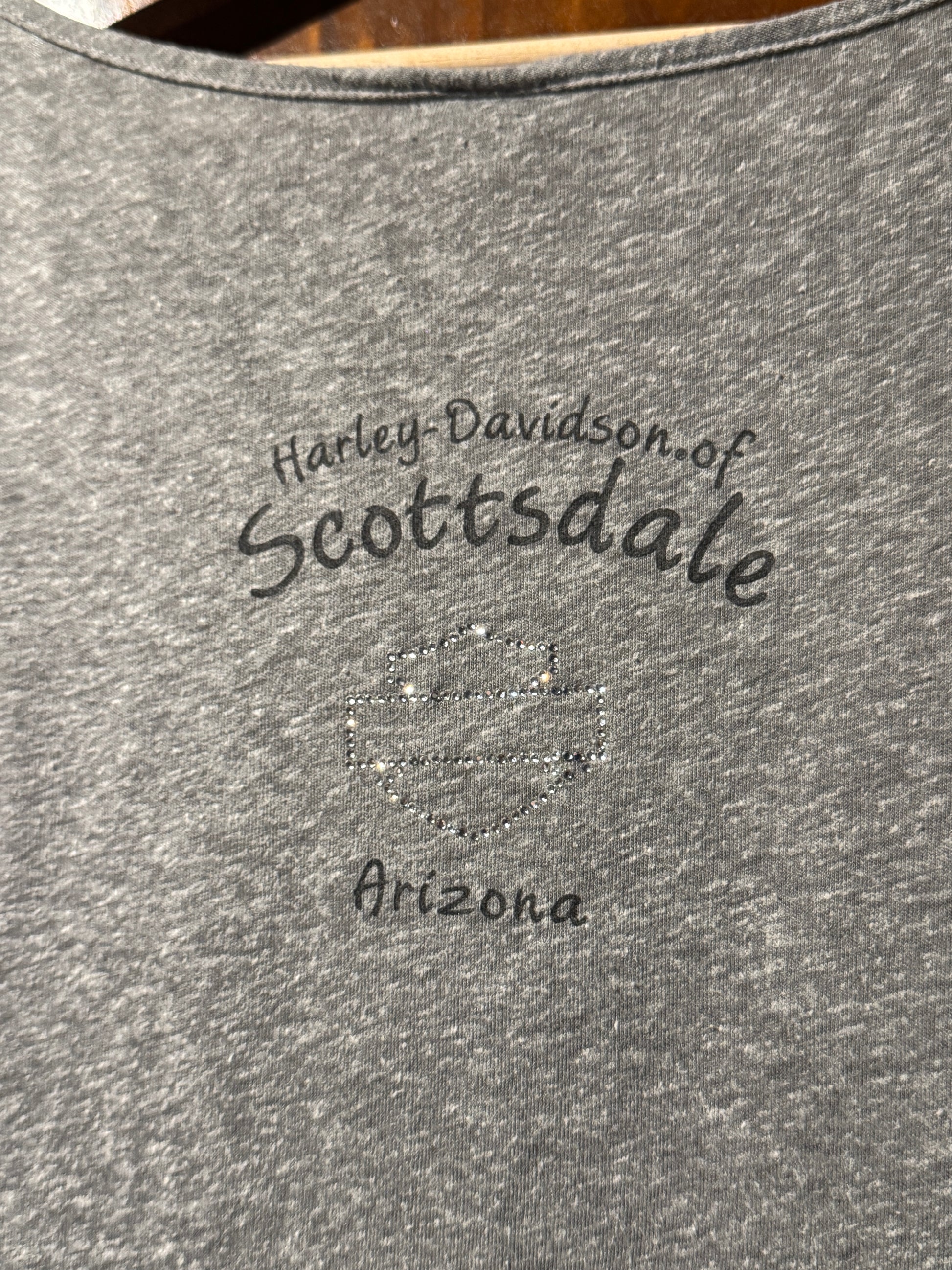 Vintage Harley Davidson women’s tee featuring a studded eagle graphic to the front and Harley Davidson of Scottsdale, Arizona print to the back. Soft grey marle cotton with a relaxed drape, subtle sparkle detailing and classic Harley grit. A great throw on piece that works oversized or fitted depending how you style it. 100% Cotton