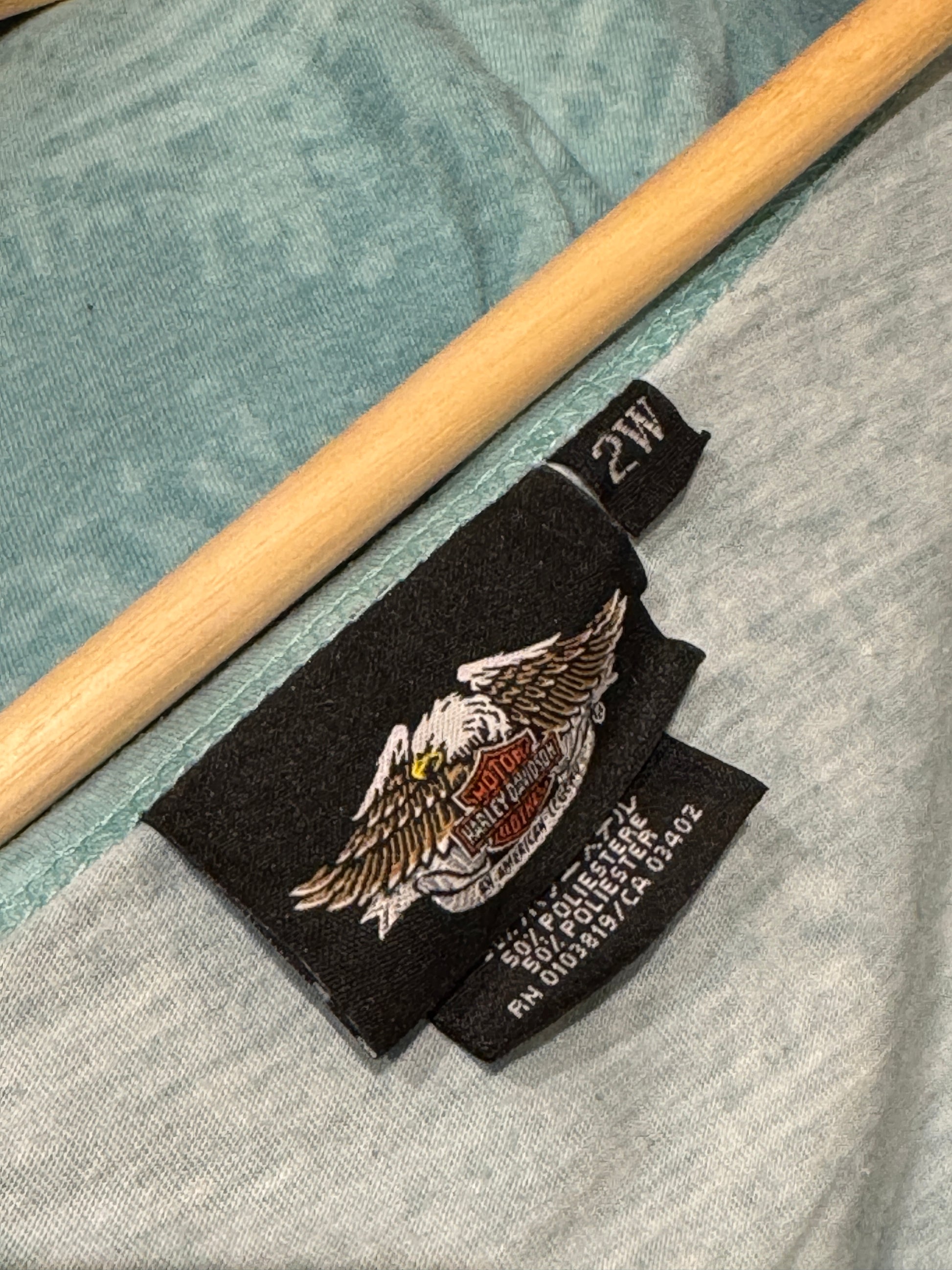 Vintage Harley Davidson women’s long sleeve top in a washed aqua blue with winged Harley Davidson logo across the chest. Features subtle all over tonal print with stud detailing throughout the wings for a soft hit of sparkle. Lightweight cotton blend with a relaxed drape and wide scoop neckline. Easy throw on piece that layers well or works solo.