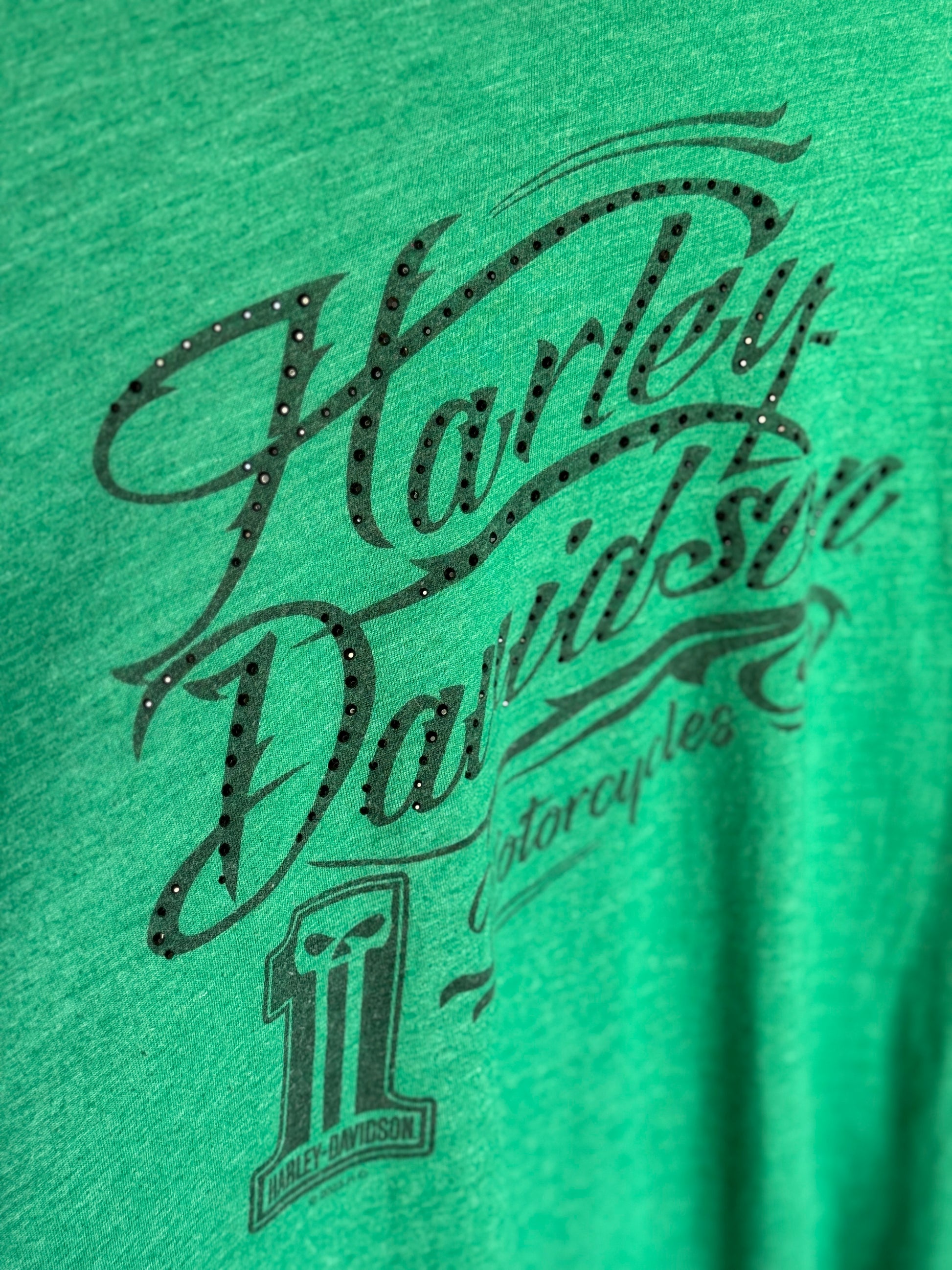 Vintage womens green Harley Davidson tee with appliqué logo.