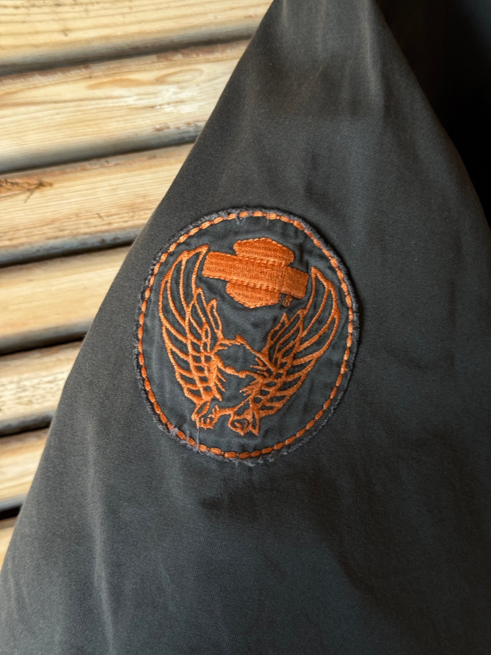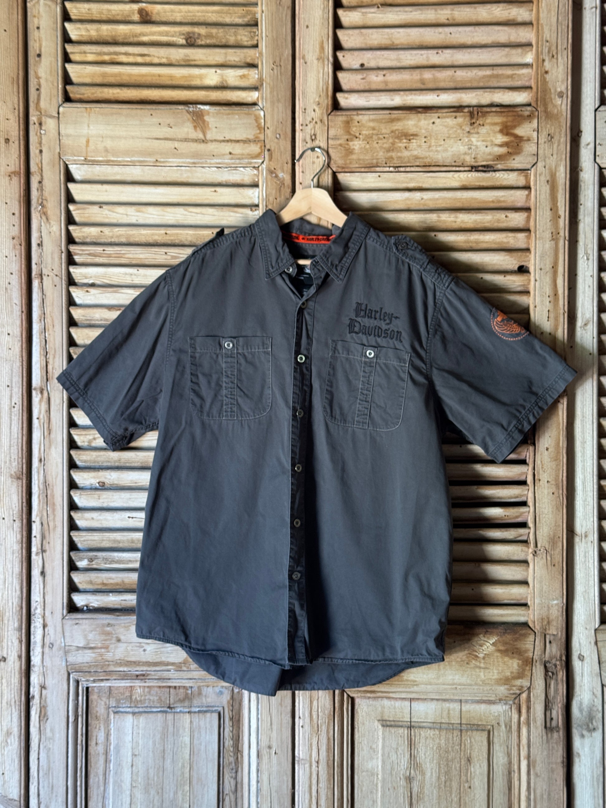 A classic Harley Davidson short sleeve shirt in a charcoal-grey fade, featuring bold gothic embroidery across the chest and back, plus an eagle patch on the sleeve. Dual button flap pockets give it that proper MotorClothes workwear feel, and the soft 100% cotton has worn in perfectly.