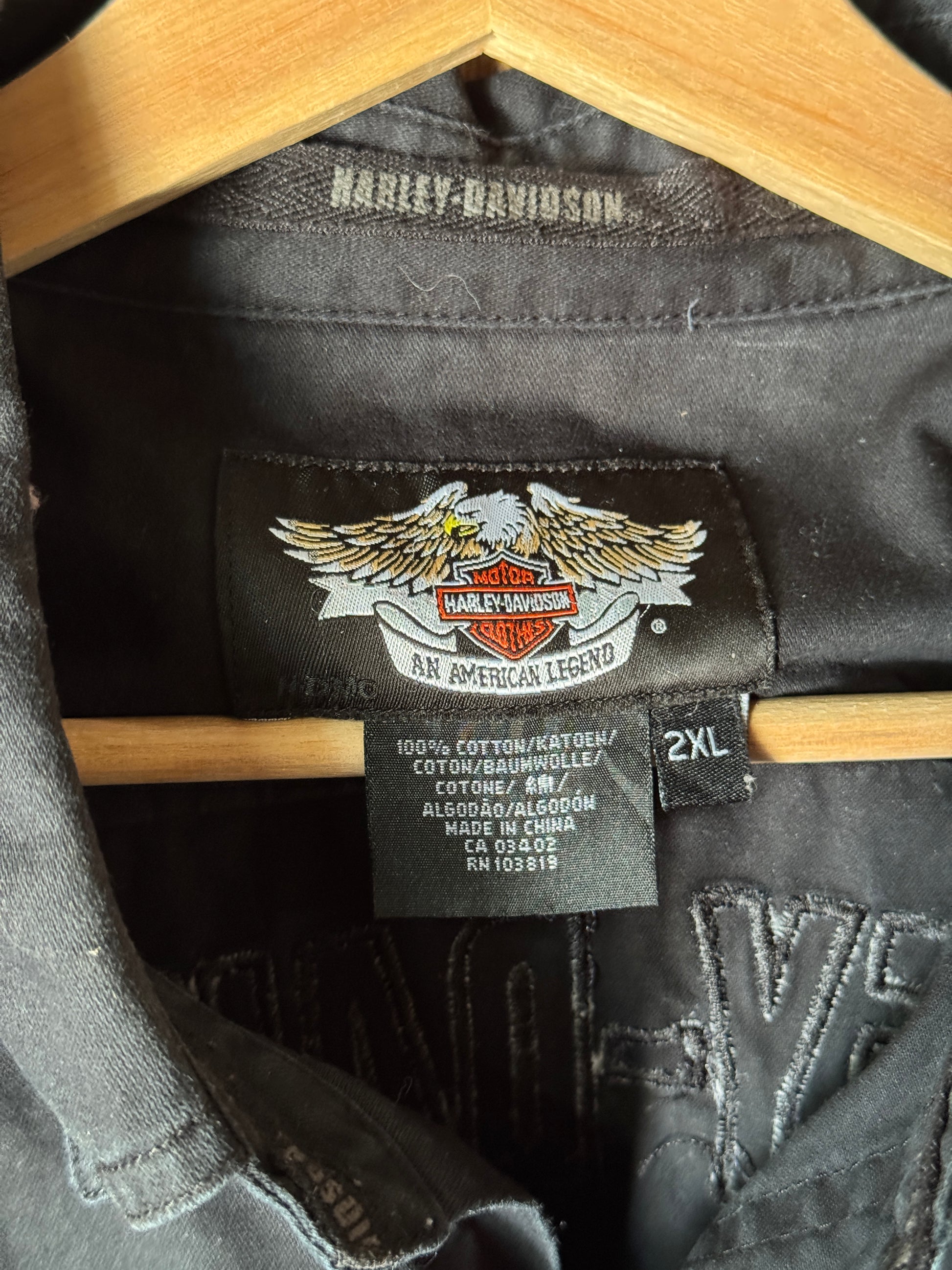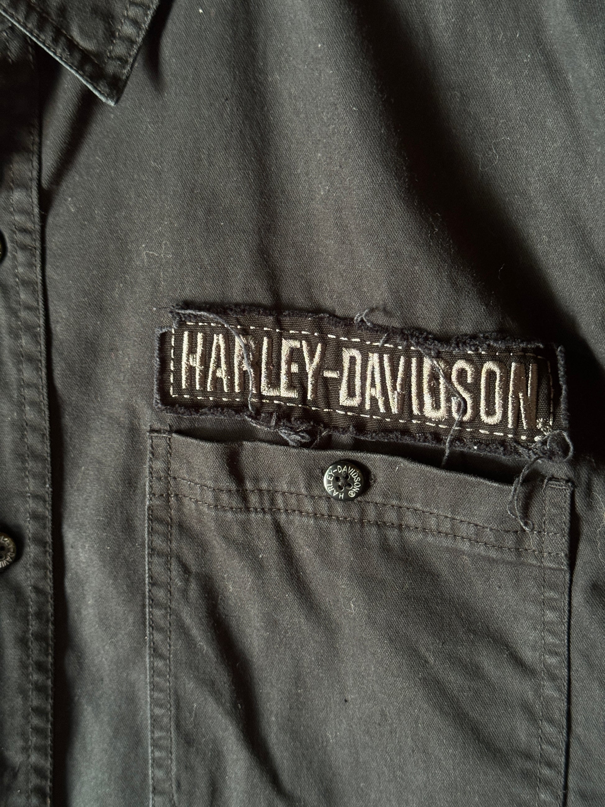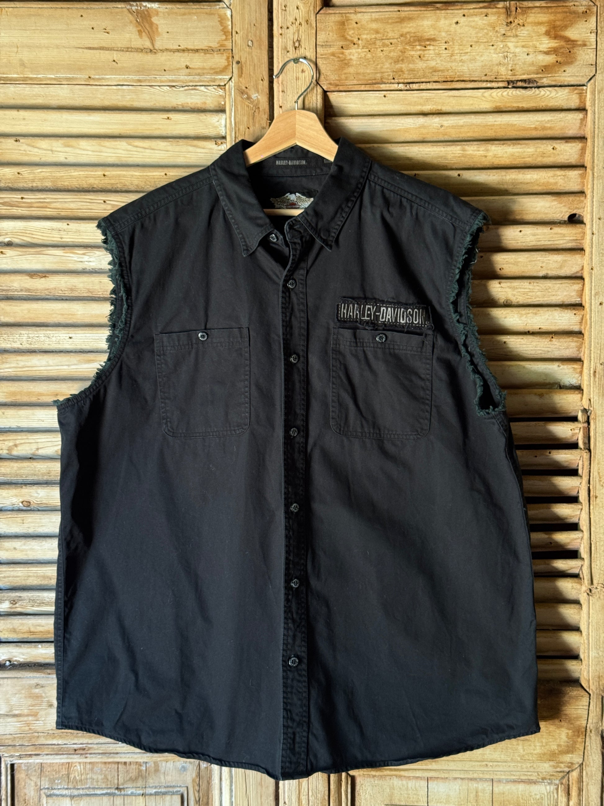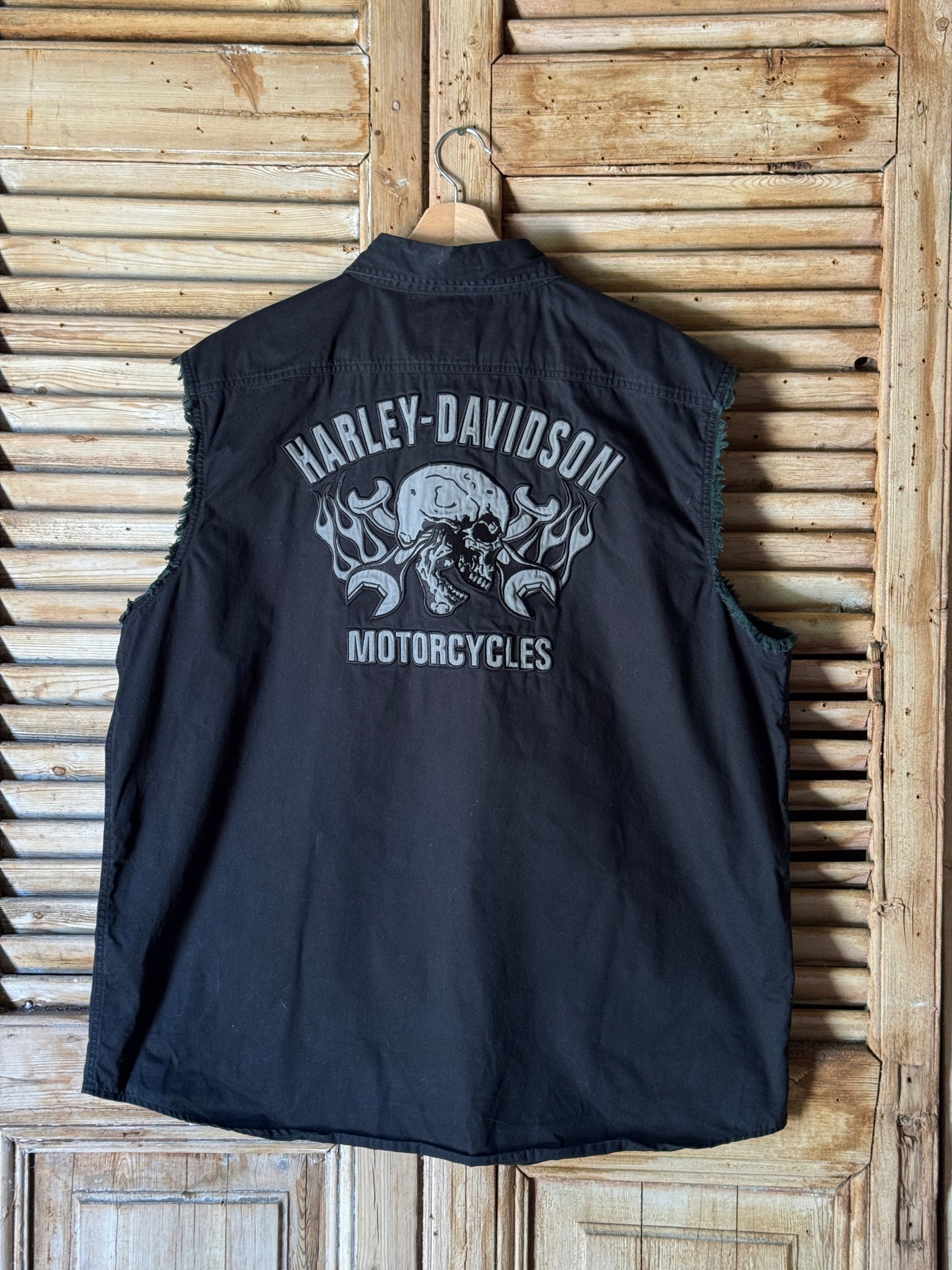 A killer sleeveless Harley button-up with the perfect worn in edge - classic black cotton, raw cut armholes and a distressed Harley Davidson patch across the chest. The back features an oversized embroidered skull and wrench graphic, making it a proper stand out piece for anyone who loves their Harley gear loud.