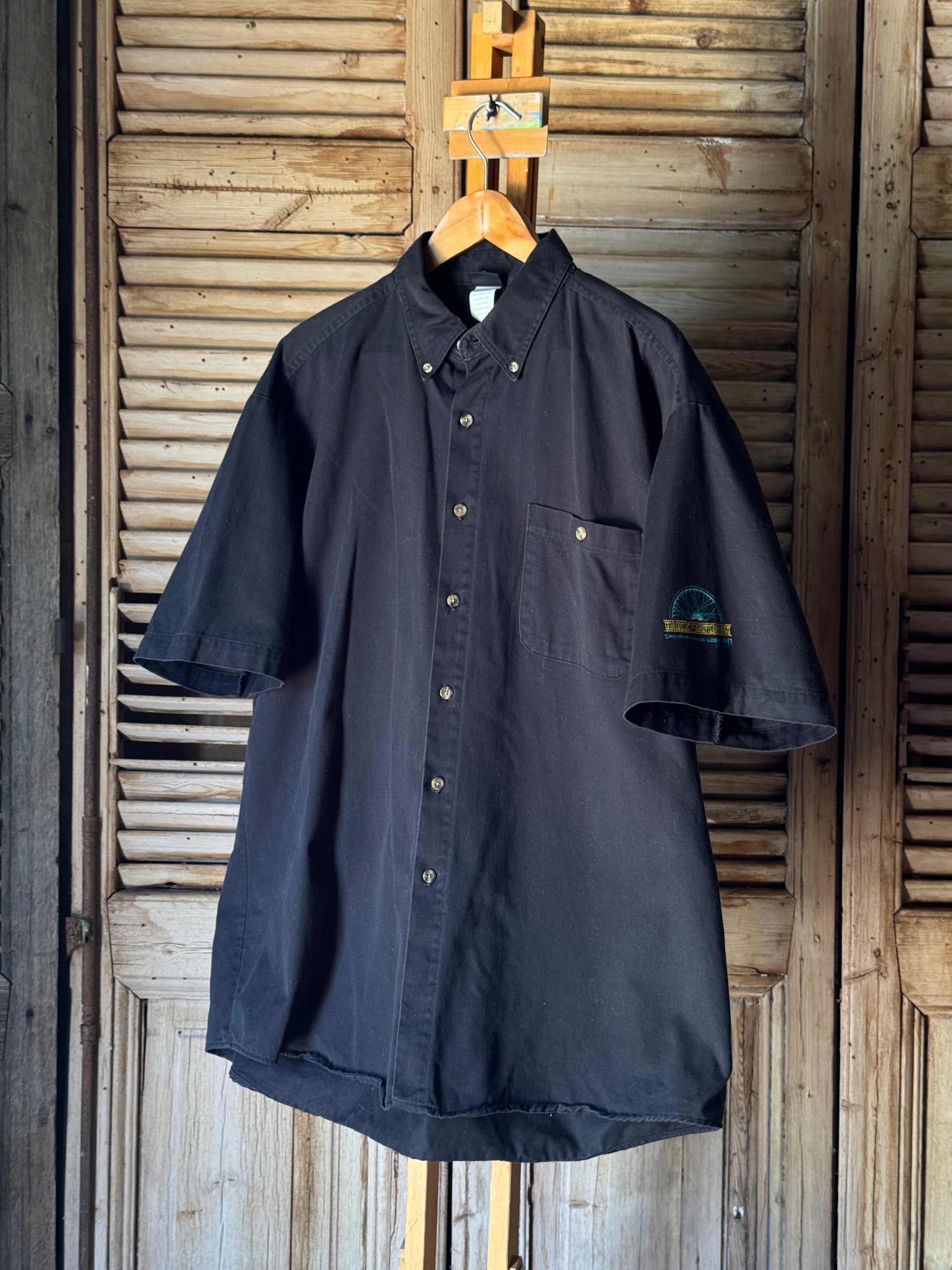 A true slice of 90s biker culture - this Harley Davidson button down shirt comes from Daytona Bike Week 1997, featuring a bold neon wheel graphic across the back and matching sleeve embroidery. Made from 100% cotton, cut in that classic roomy 90s XL fit, and proudly Made in the U.S.A. Chest pocket, button-down collar, and the original HD tag still intact. Light age-wear throughout as expected from genuine vintage, adding to its character and authenticity.