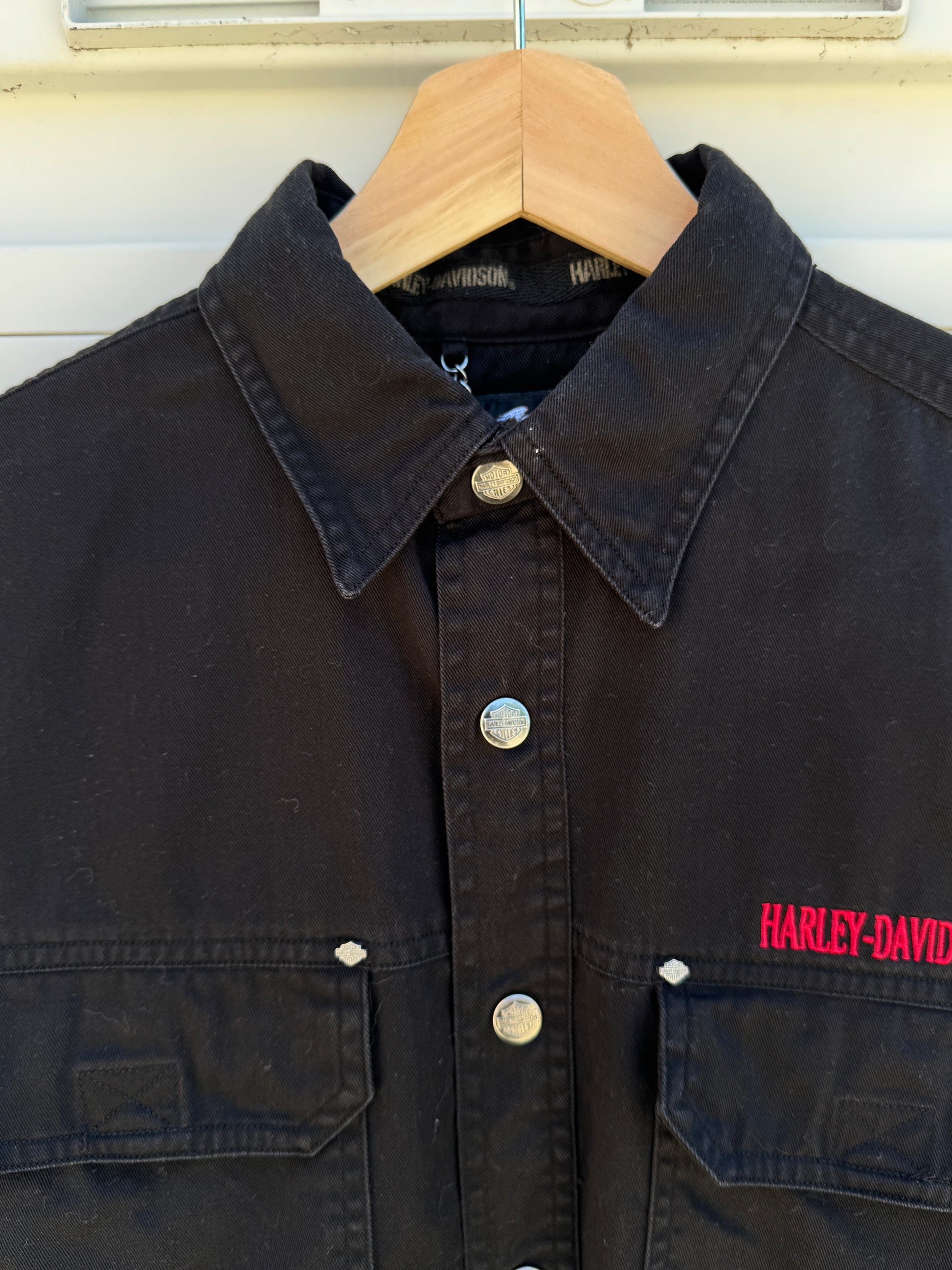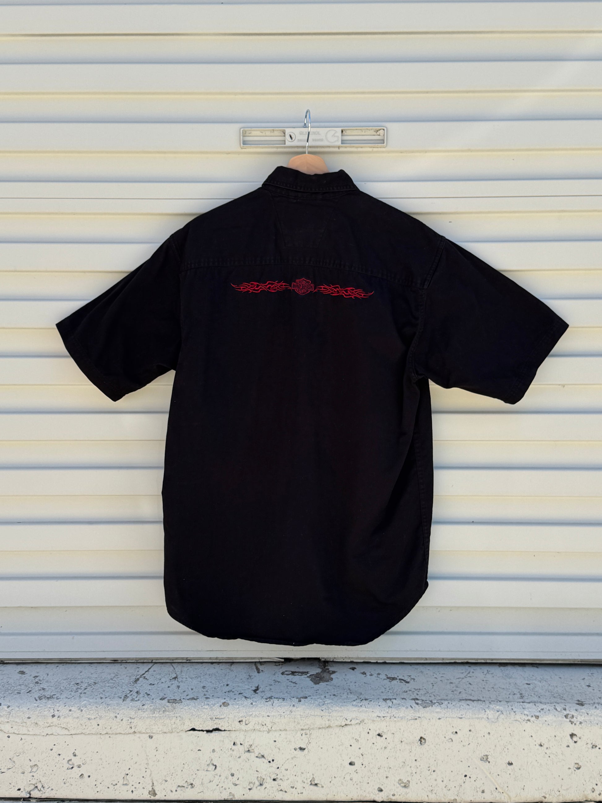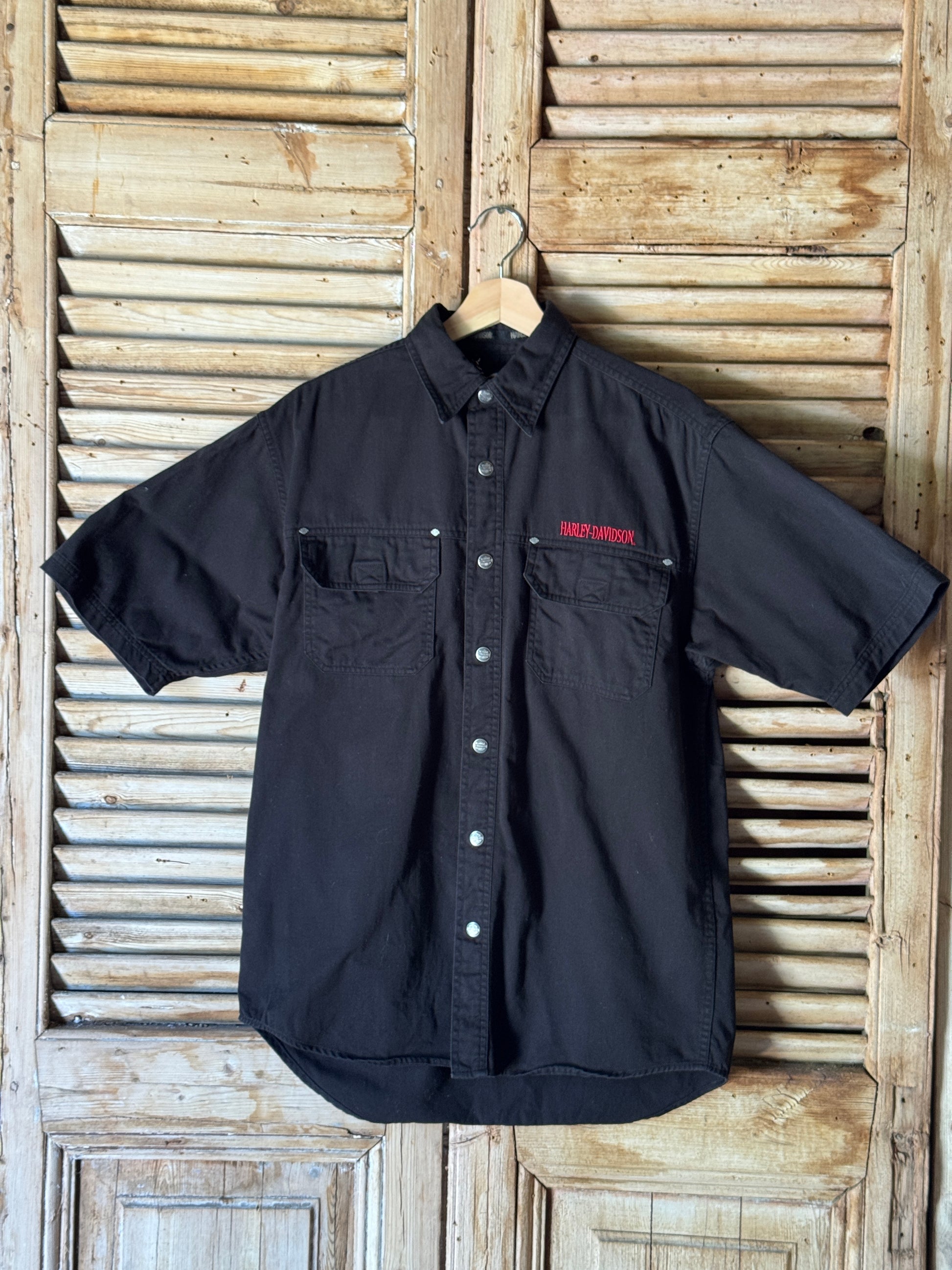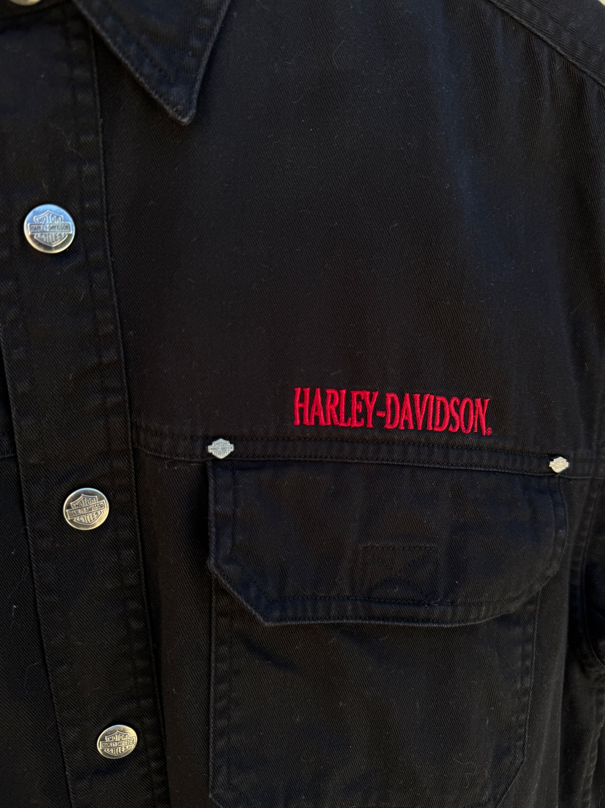 A classic black Harley shirt with bright red embroidery on the chest and a clean flame + bar & shield design across the upper back. Snap-button front, dual chest pockets, and that sturdy old school cotton that sits perfectly. Made in Hong Kong and full of that proper vintage MotorClothes attitude.
