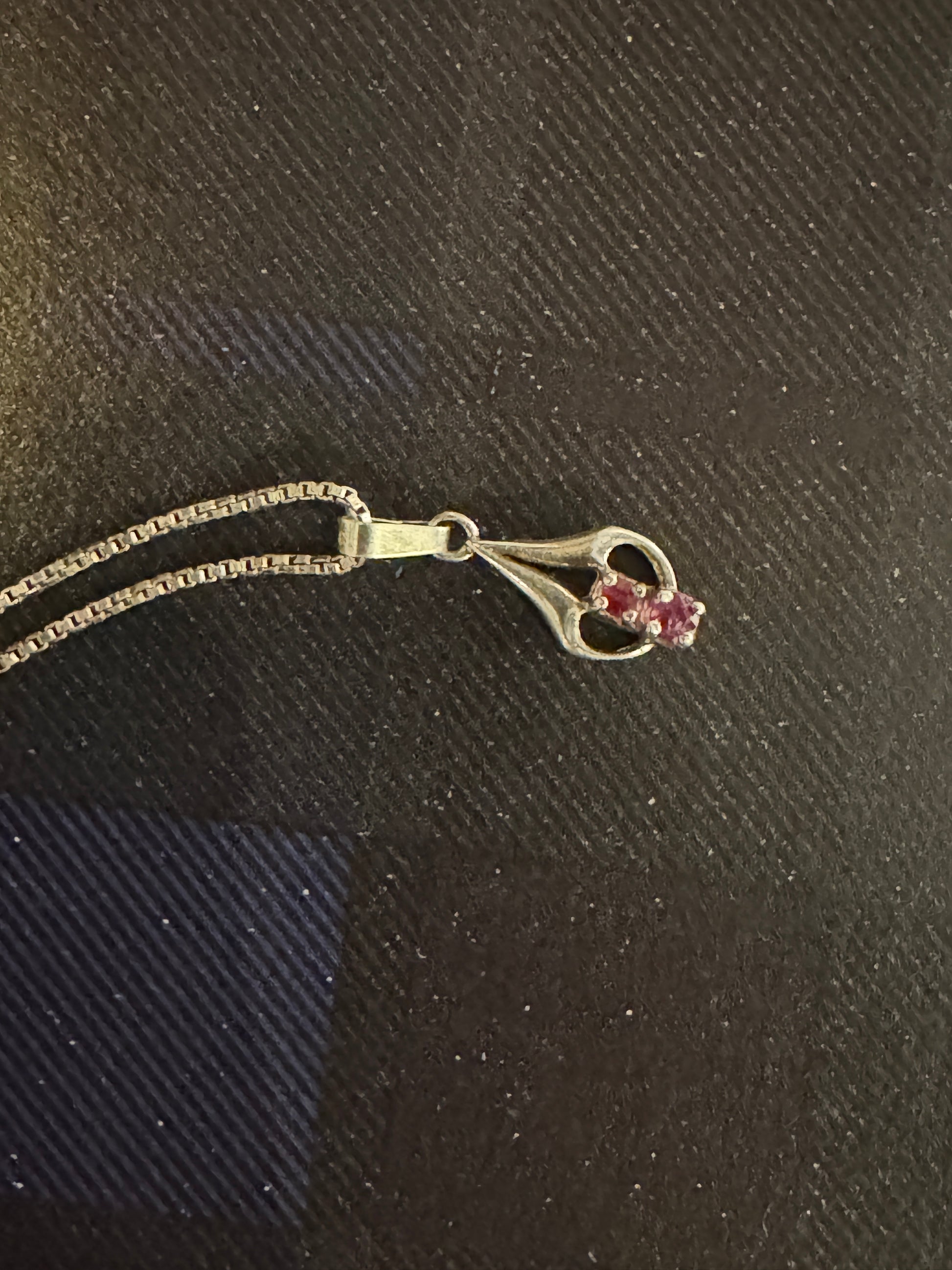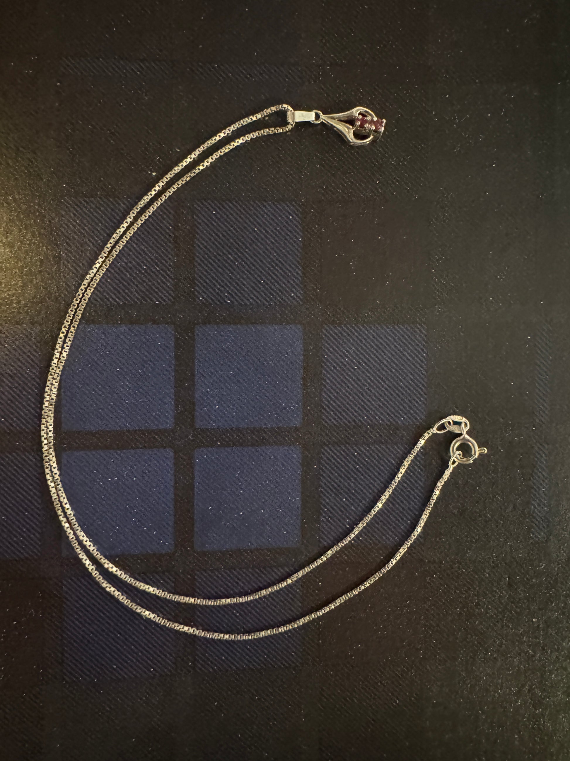 Elegant vintage 925 sterling silver necklace featuring a fine box chain and a delicate pendant set with a ruby-red stone (likely garnet or synthetic ruby).