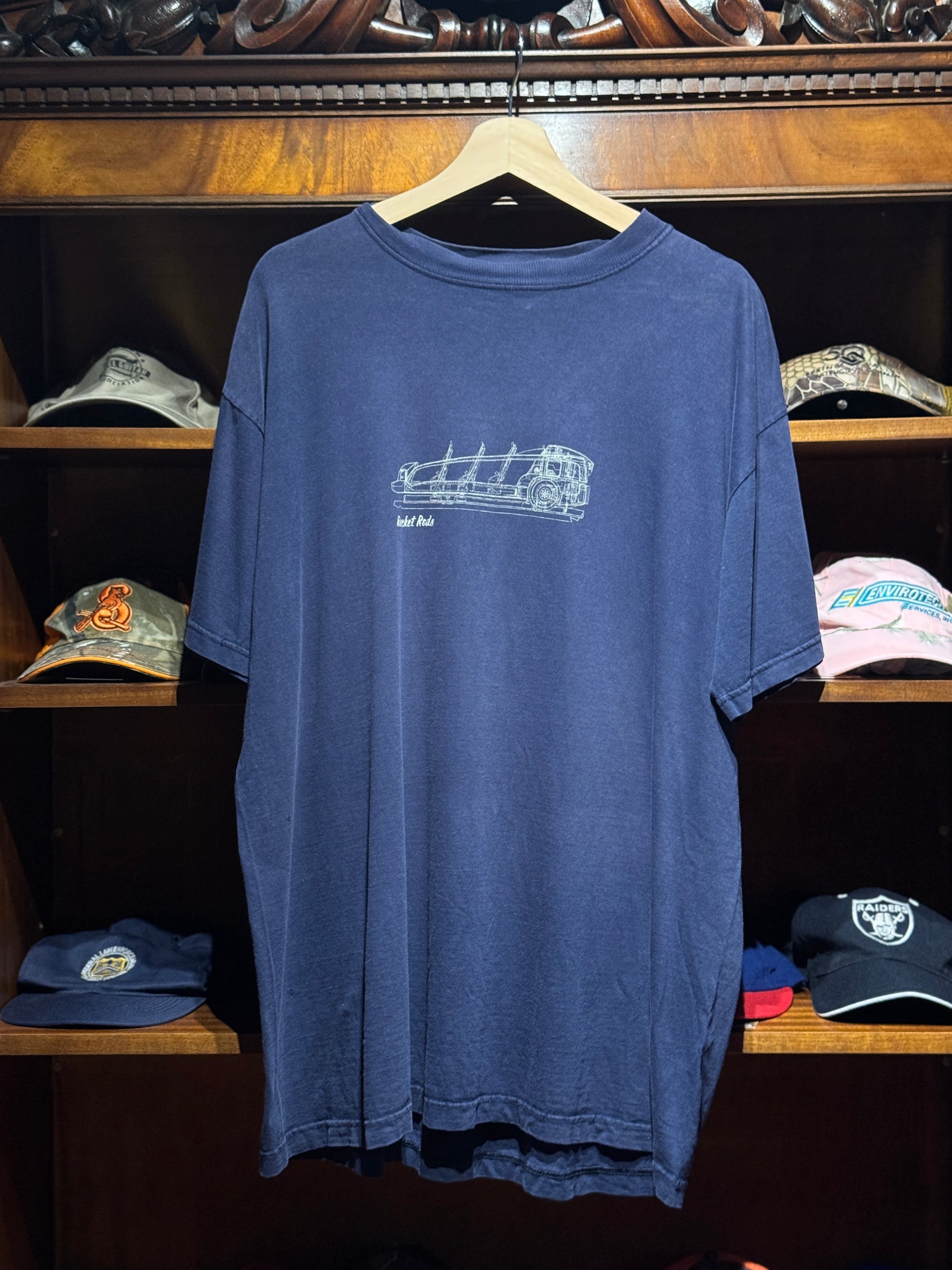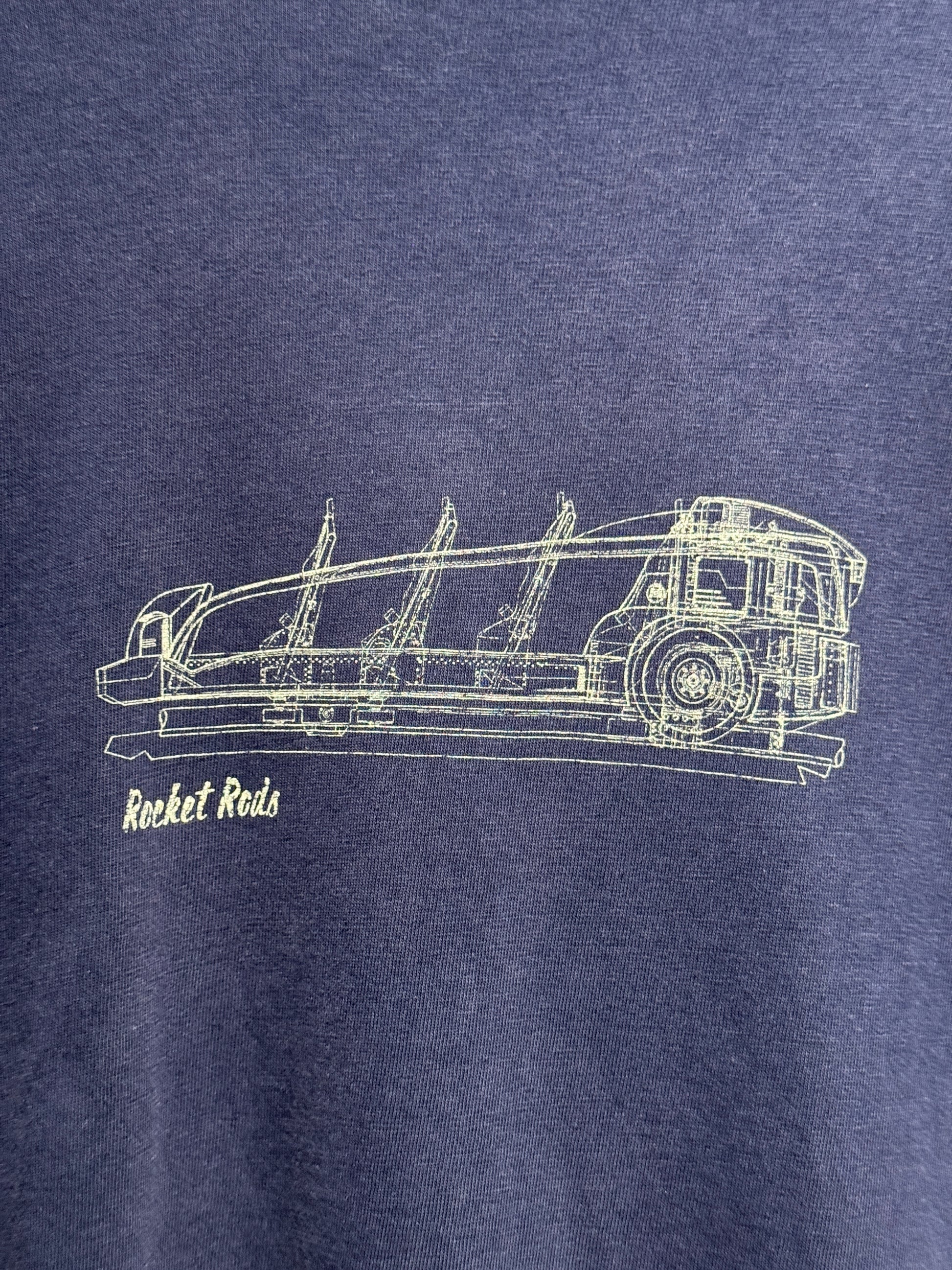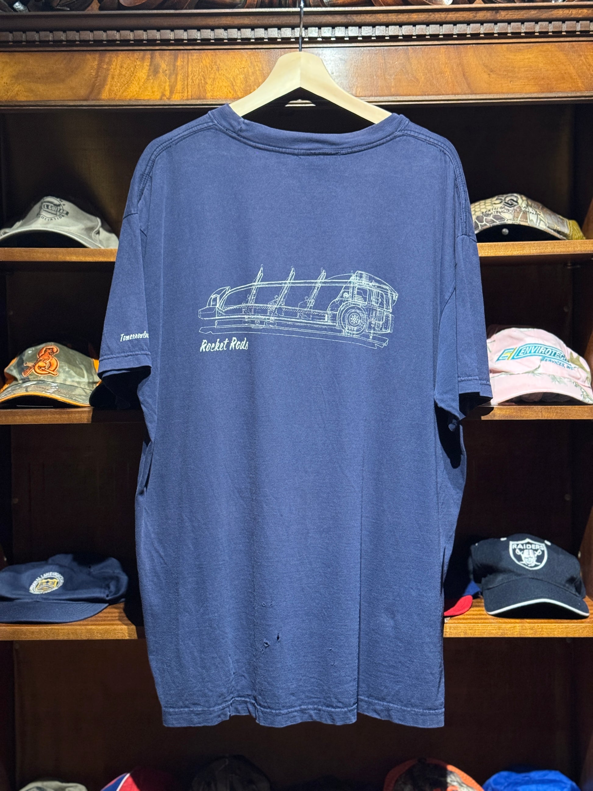 Vintage Disneyland navy tee with 'Rocket Rods' graphic to front and back. Minor holes to back.