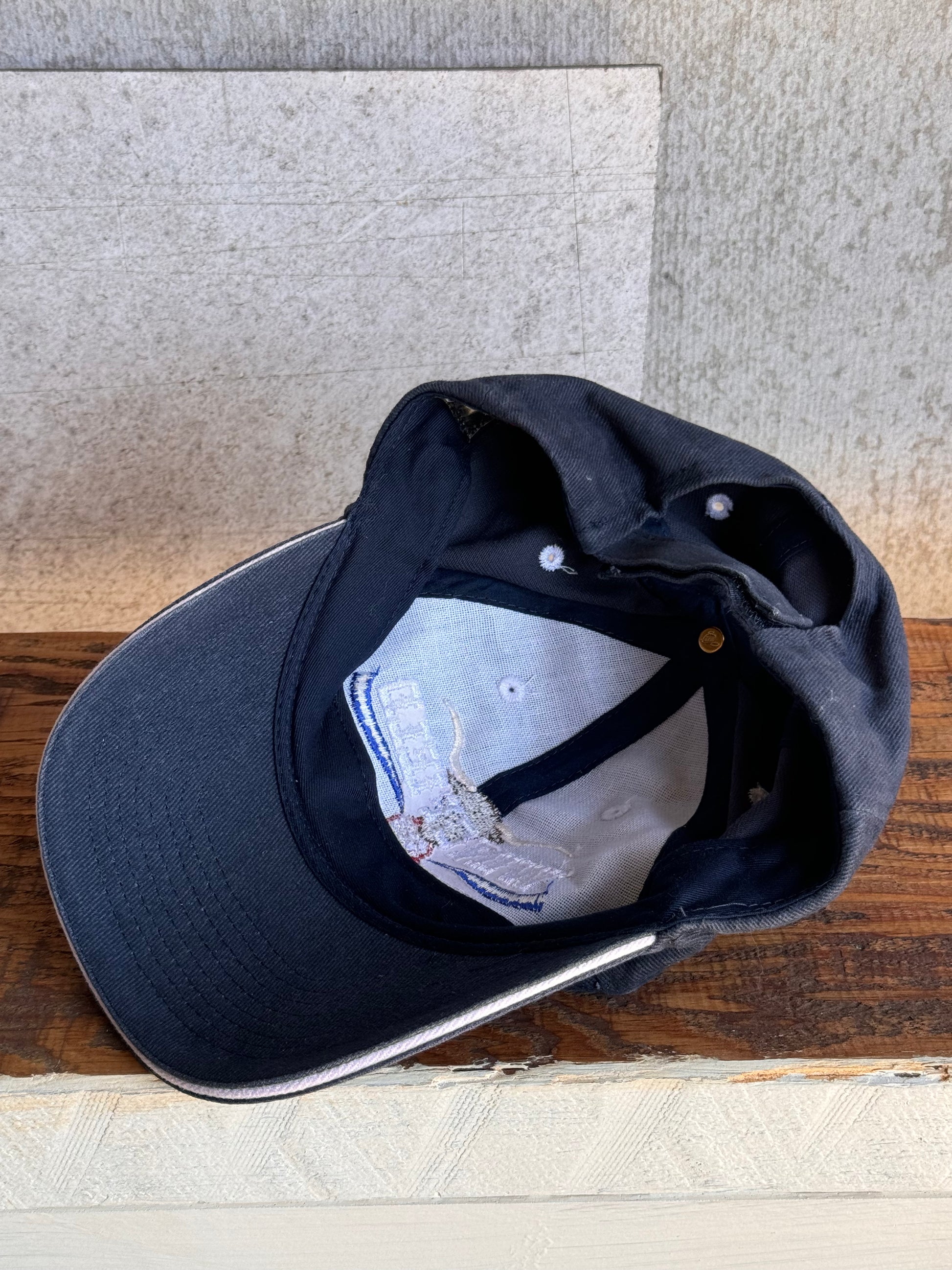 Vintage navy cotton hat with embroidered Wingfield Livestock Transport logo. Velcro closure.